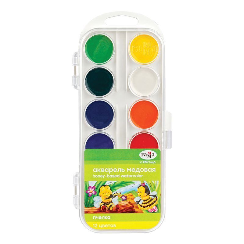 Акварель Гамма "Пчелка NEW", медовая, 12 цветов, без кисти, пластик. упак., европодвес