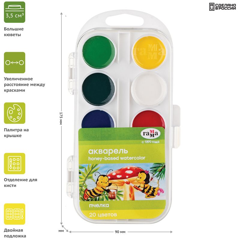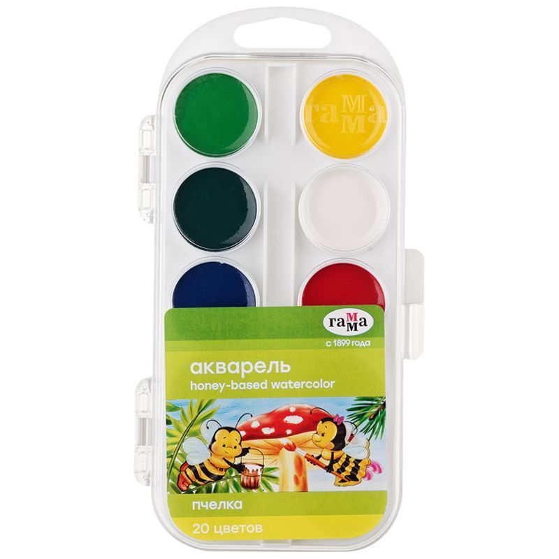 Акварель Гамма "Пчелка NEW", медовая, 20 цветов, без кисти, пластик. упак., европодвес