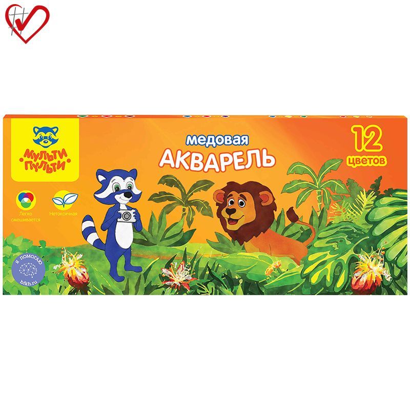 Акварель Мульти-Пульти "Енот в джунглях", медовая, 12 цветов, без кисти, картон
