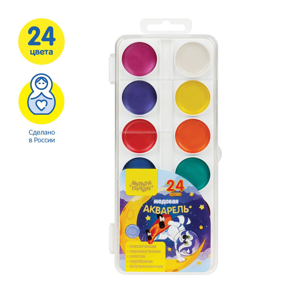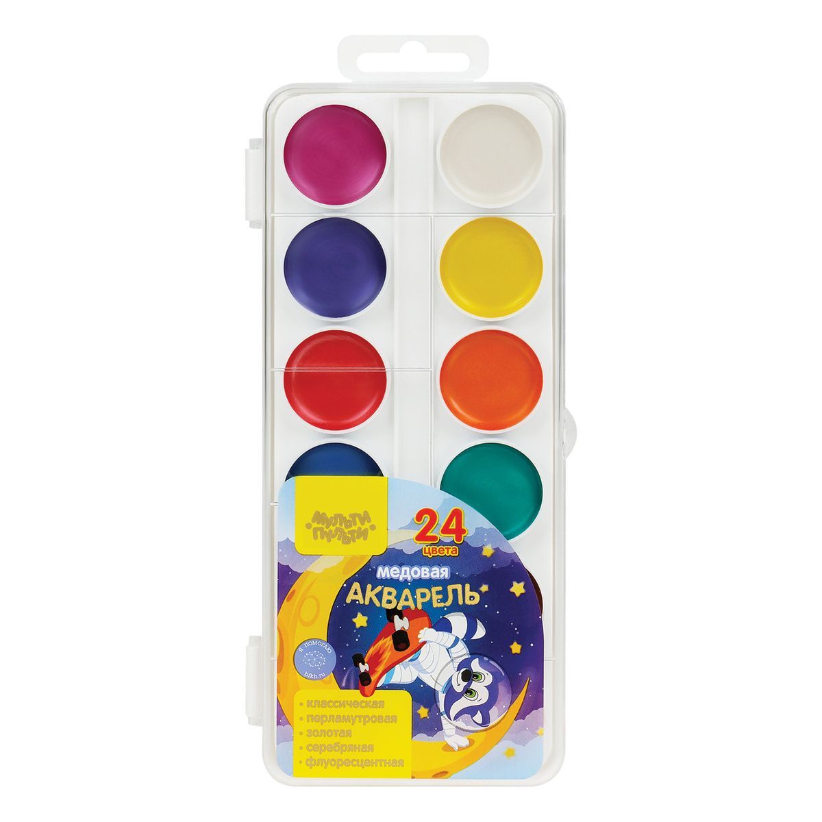 Акварель Мульти-Пульти "Енот в космосе", медовая, 24 цвета, перламутровая, без кисти, пластик - (8 перл.+золото+серебро+2 флуор.)