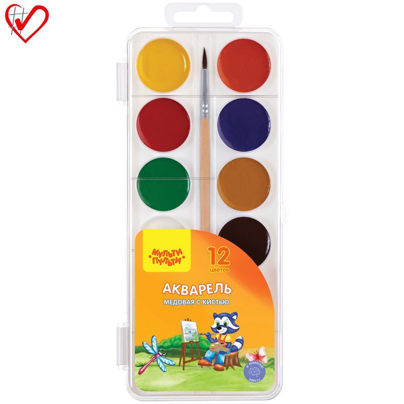 Акварель Мульти-Пульти "Приключения Енота", медовая, 12 цветов, с кистью, пластик
