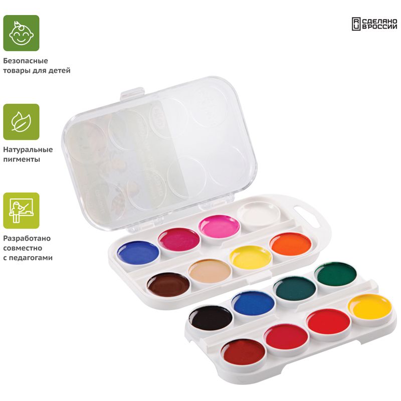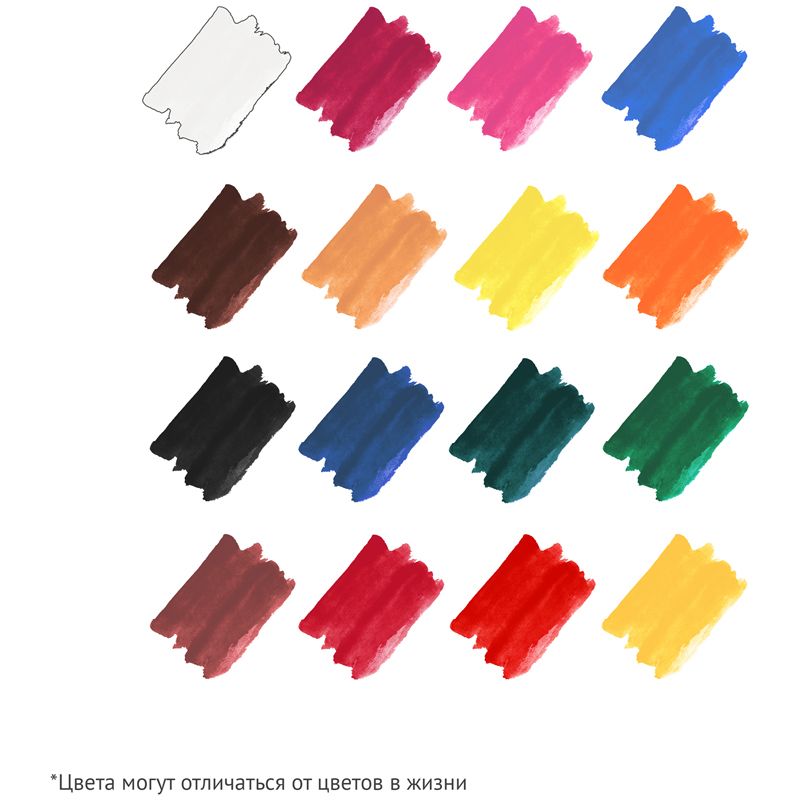Набор: 16 цветов в кюветах. Объем кюветы - 3,5 см3. Без кисти.