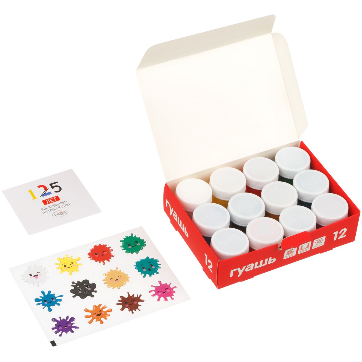 Наклейки с забавной кляксой с цветом краски в каждой коробке! Мы предлагаем юному художнику развивающую игру - найти нужный цвет и наклеить соответствующую наклейку на крышечку.