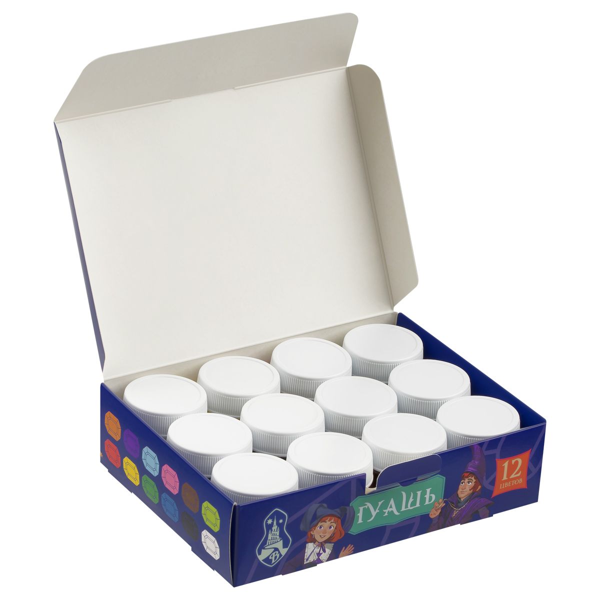 Набор удобно брать с собой. Гуашь упакована в пластиковые герметичные баночки с завинчивающейся крышкой. Объём каждой баночки — 17,5 мл, общий объём набора — 210 мл. Состав безопасен. Краска легко смывается с рук водой. Для детей старше 3-х лет.
