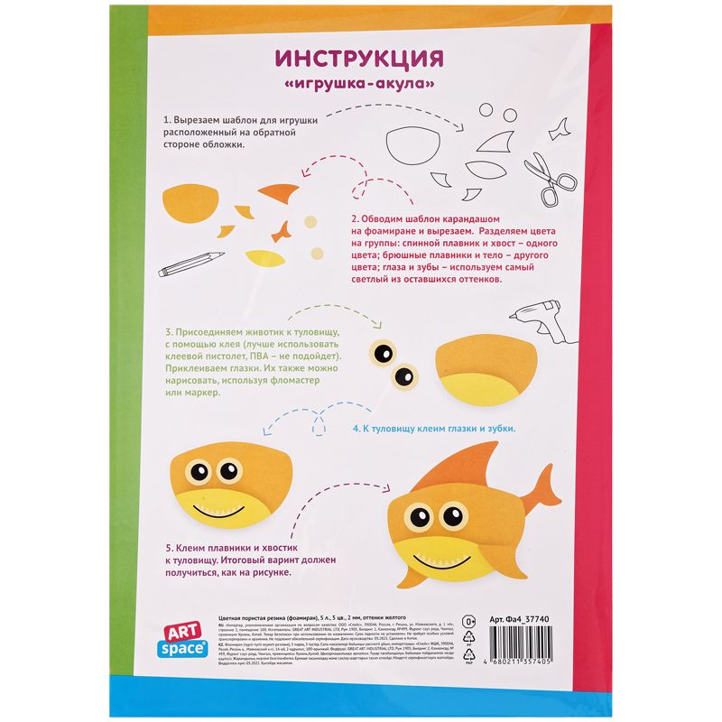 Цветная пористая резина (фоамиран) ArtSpace, А4, 5л., 5цв., 2мм, оттенки желтого