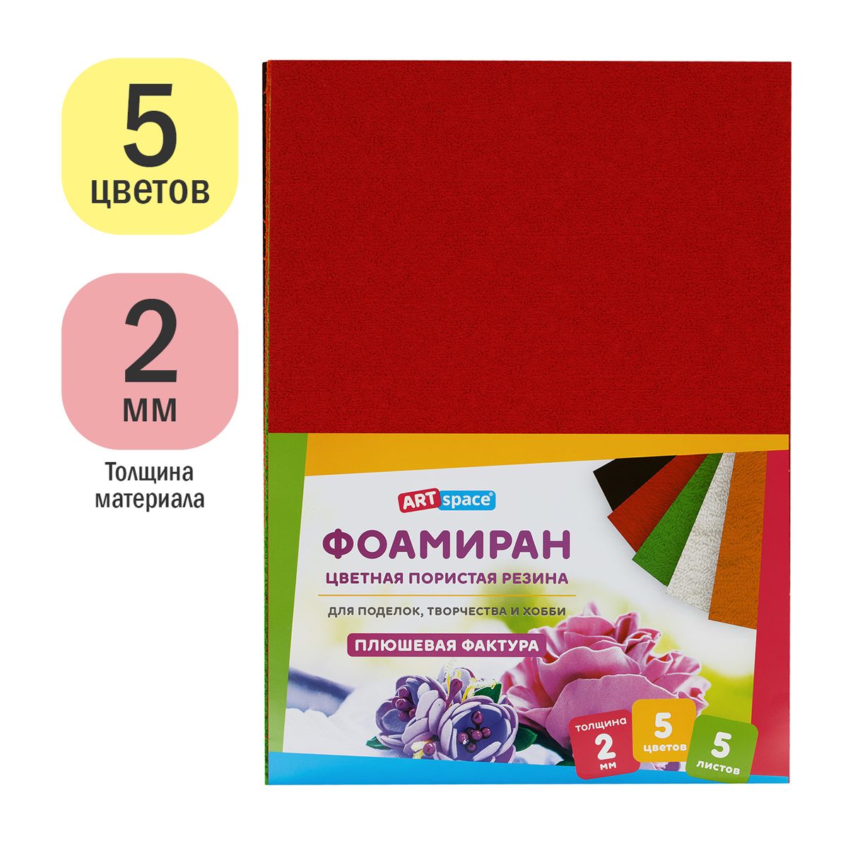 Цветная пористая резина (фоамиран) ArtSpace, А4, 5л., 5цв., 2мм, плюшевая
