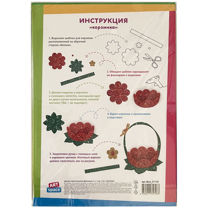 Цветная пористая резина (фоамиран) ArtSpace, А4, 5л., 5цв., 2мм, с блестками