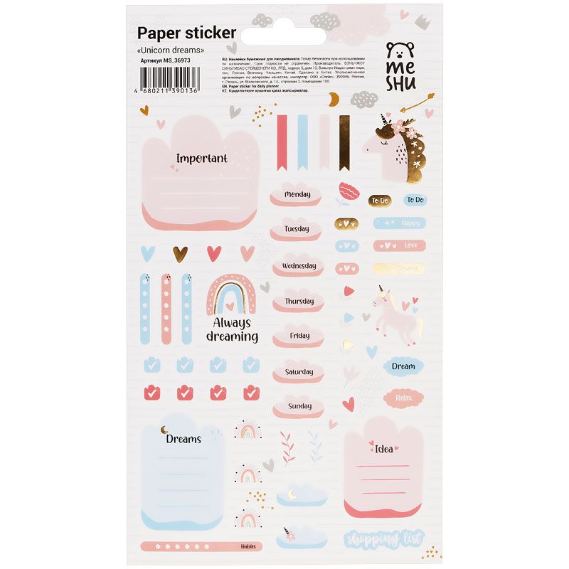 Наклейки бумажные для ежедневников MESHU "Unicorn dreams", 12*21см, фольга, 56 наклеек, европодвес