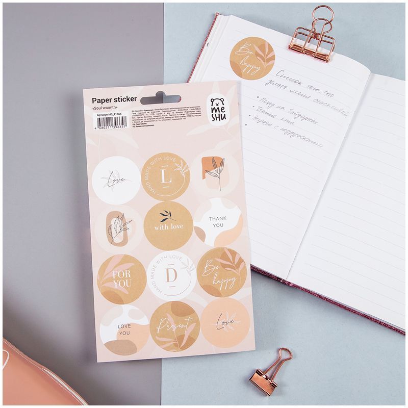 Бумажные наклейки подойдут также для украшения канцтоваров, открыток, поделок, телефонов, ноутбуков, предметов интерьера. Яркие современные дизайны от MESHU сделают творческий процесс увлекательным и подарят отличное настроение. Наклейки упакованы в пакет с европодвесом.