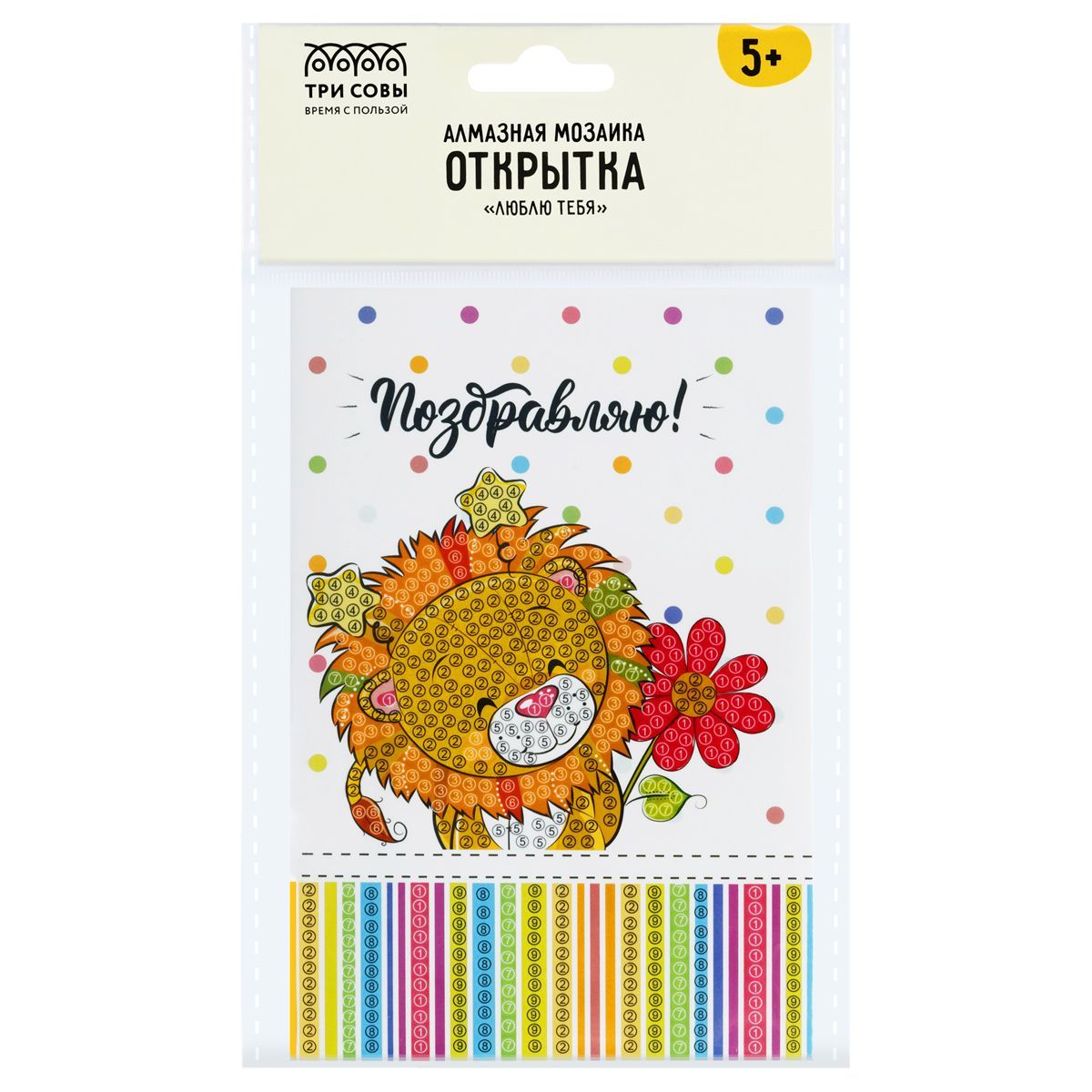 Алмазная мозаика, открытка ТРИ СОВЫ Люблю тебя "Поздравляю", пакет с европодвесом