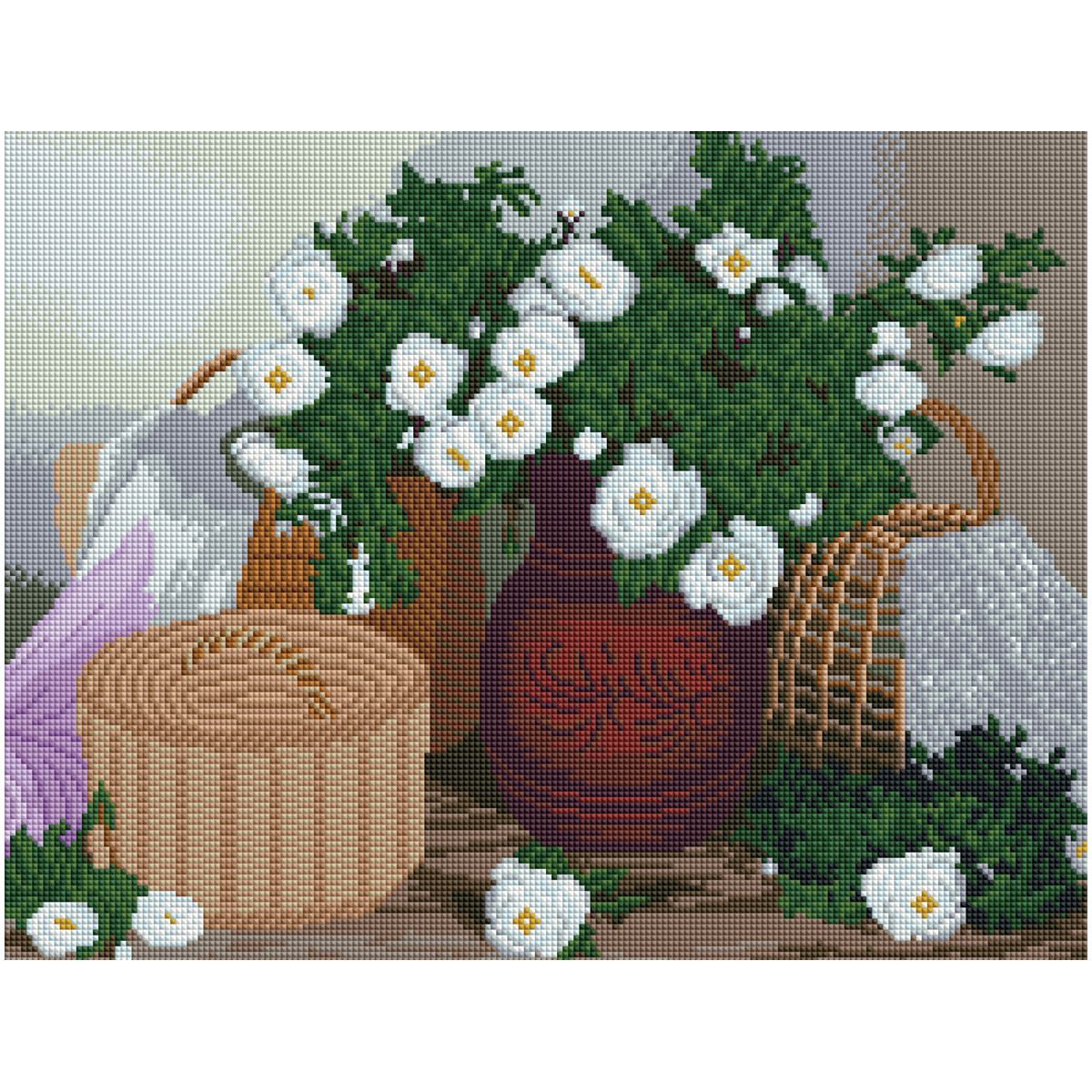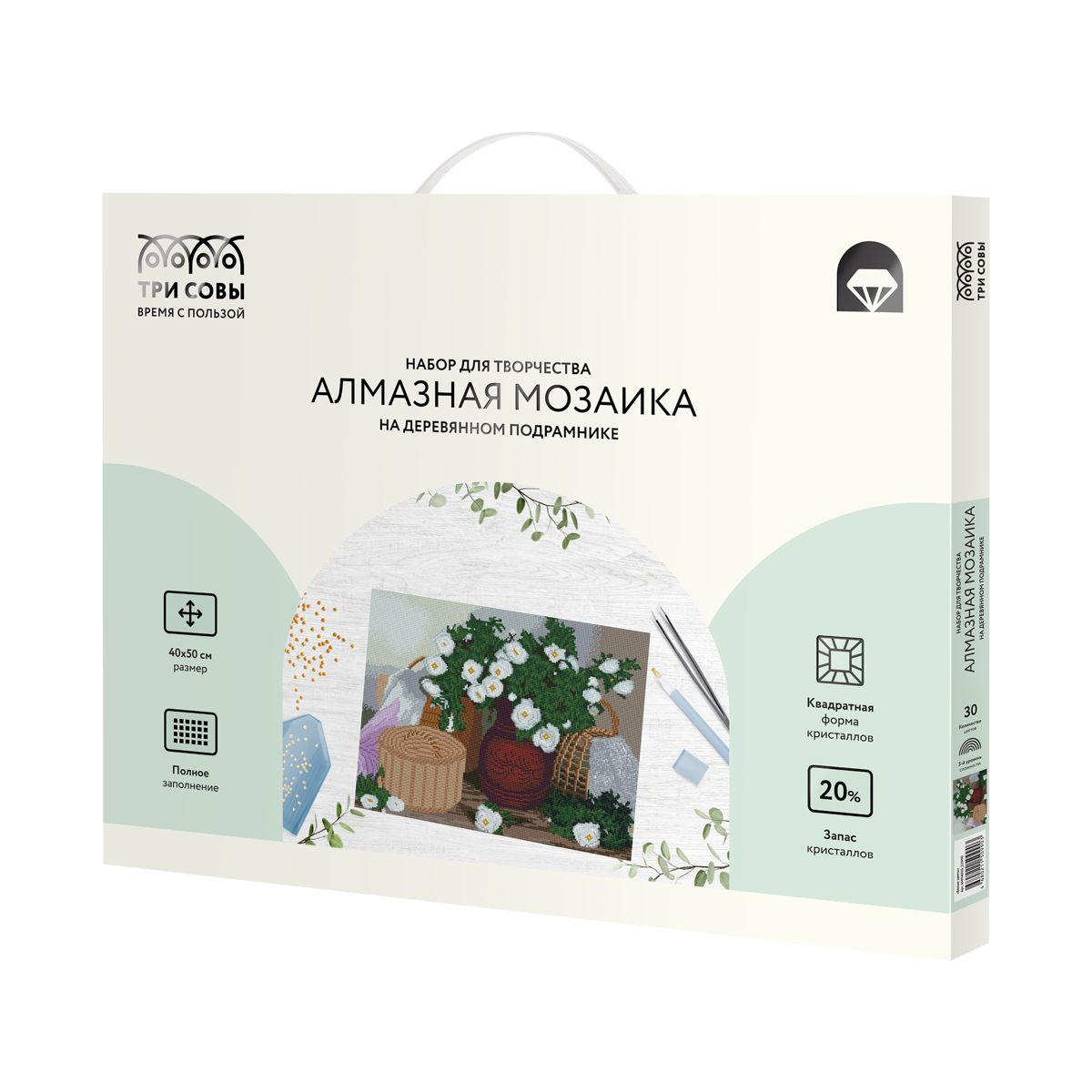 Алмазная мозаика ТРИ СОВЫ "Белые цветы", 40*50см, холст на деревянном подрамнике, картонная коробка с пластиковой ручкой