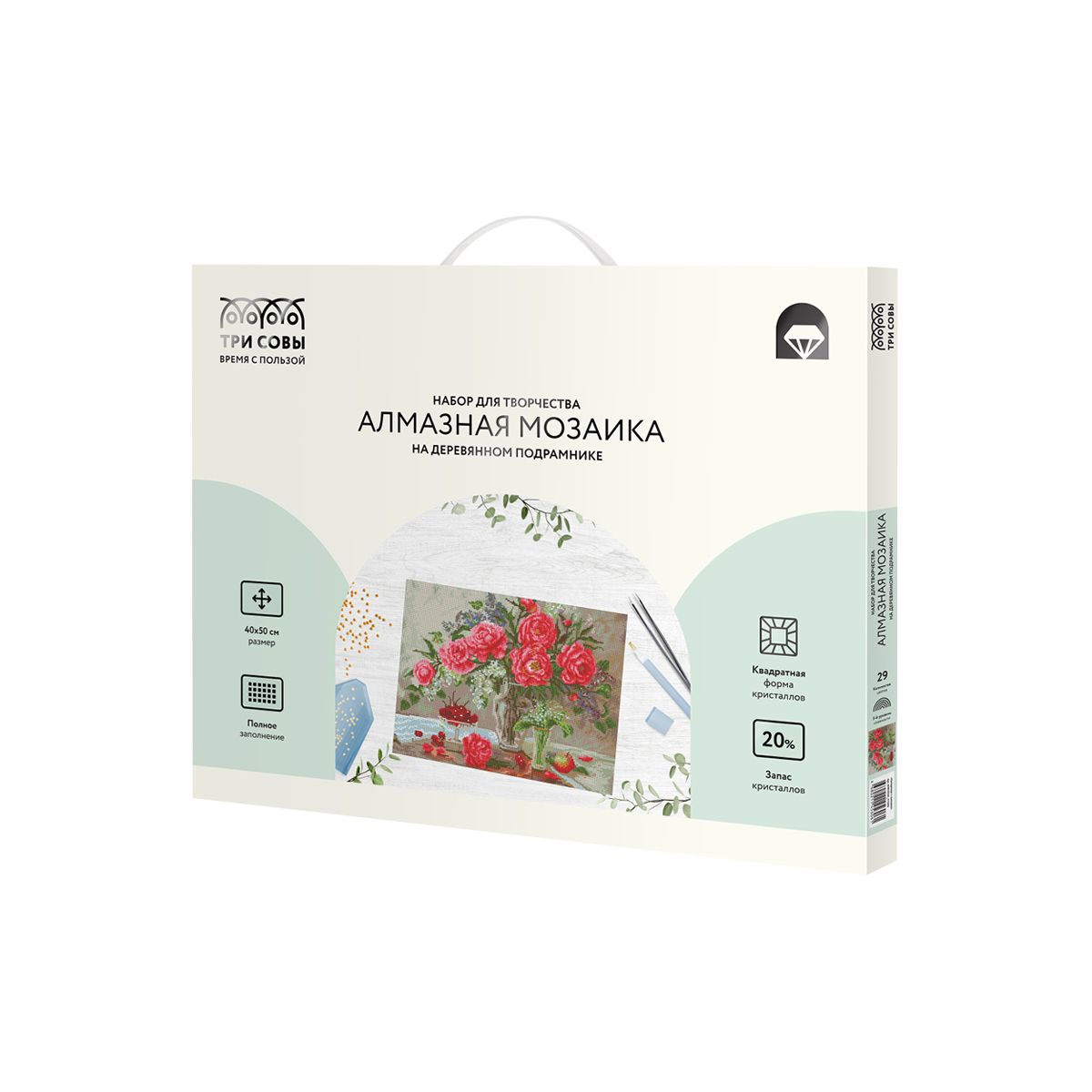 Алмазная мозаика ТРИ СОВЫ "Натюрморт с пионами", 40*50см, холст на деревянном подрамнике, картонная коробка с пластиковой ручкой