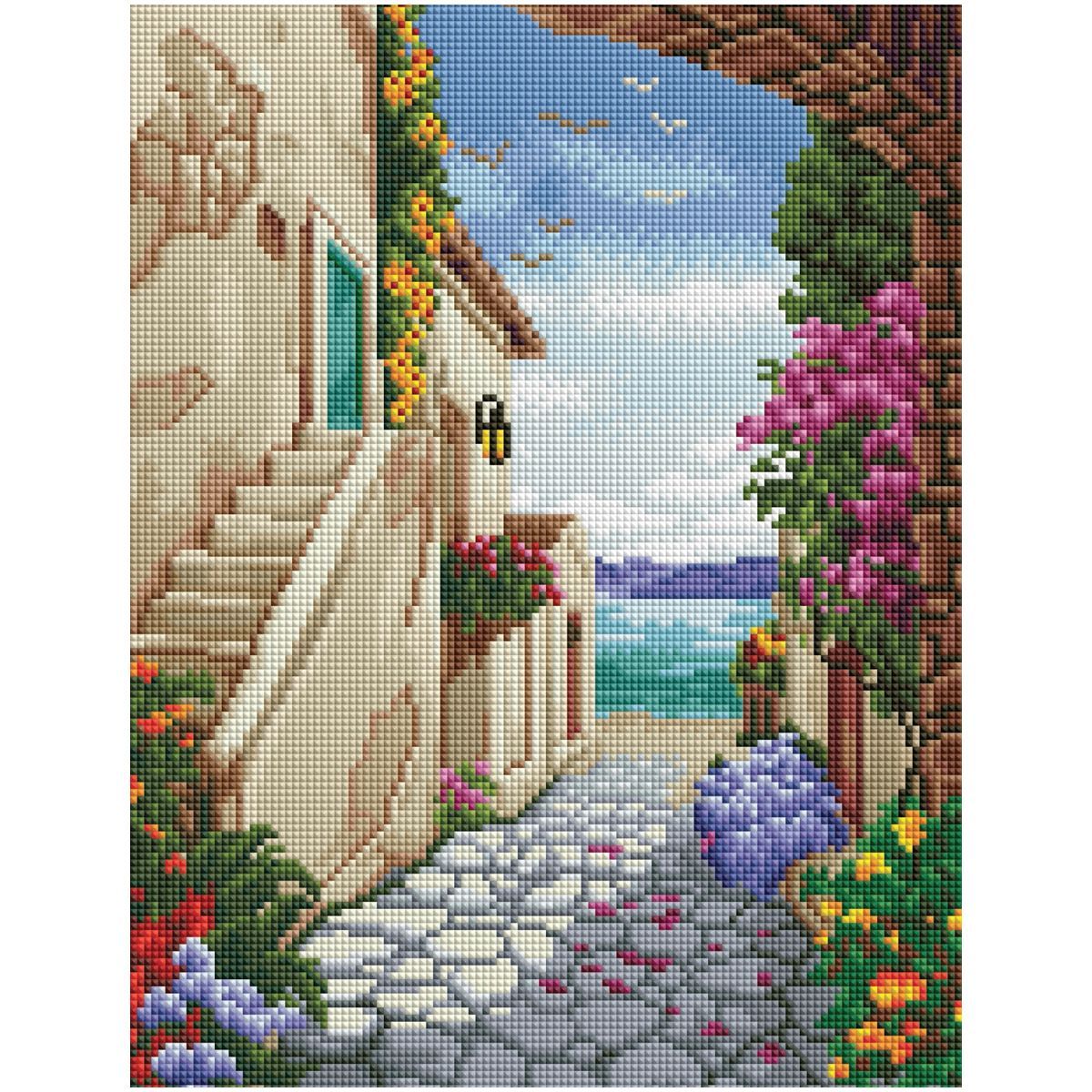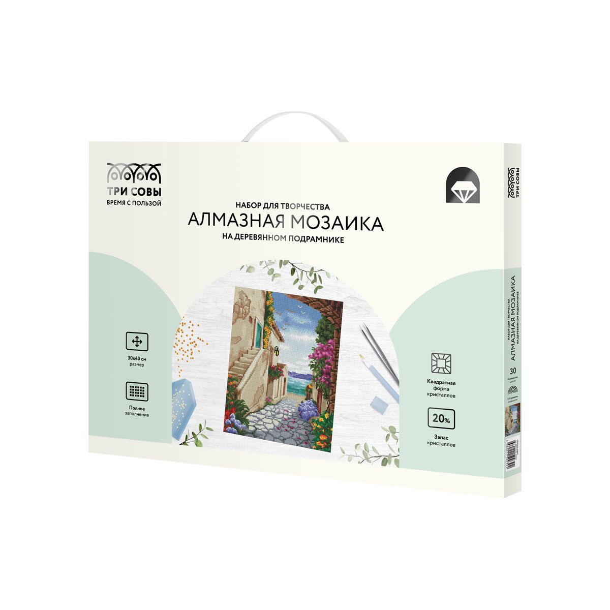 Алмазная мозаика ТРИ СОВЫ "Улочка к морю", 30*40см, холст на деревянном подрамнике, картонная коробка с пластиковой ручкой