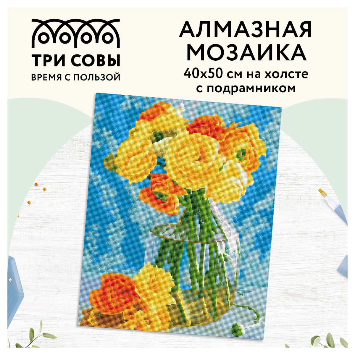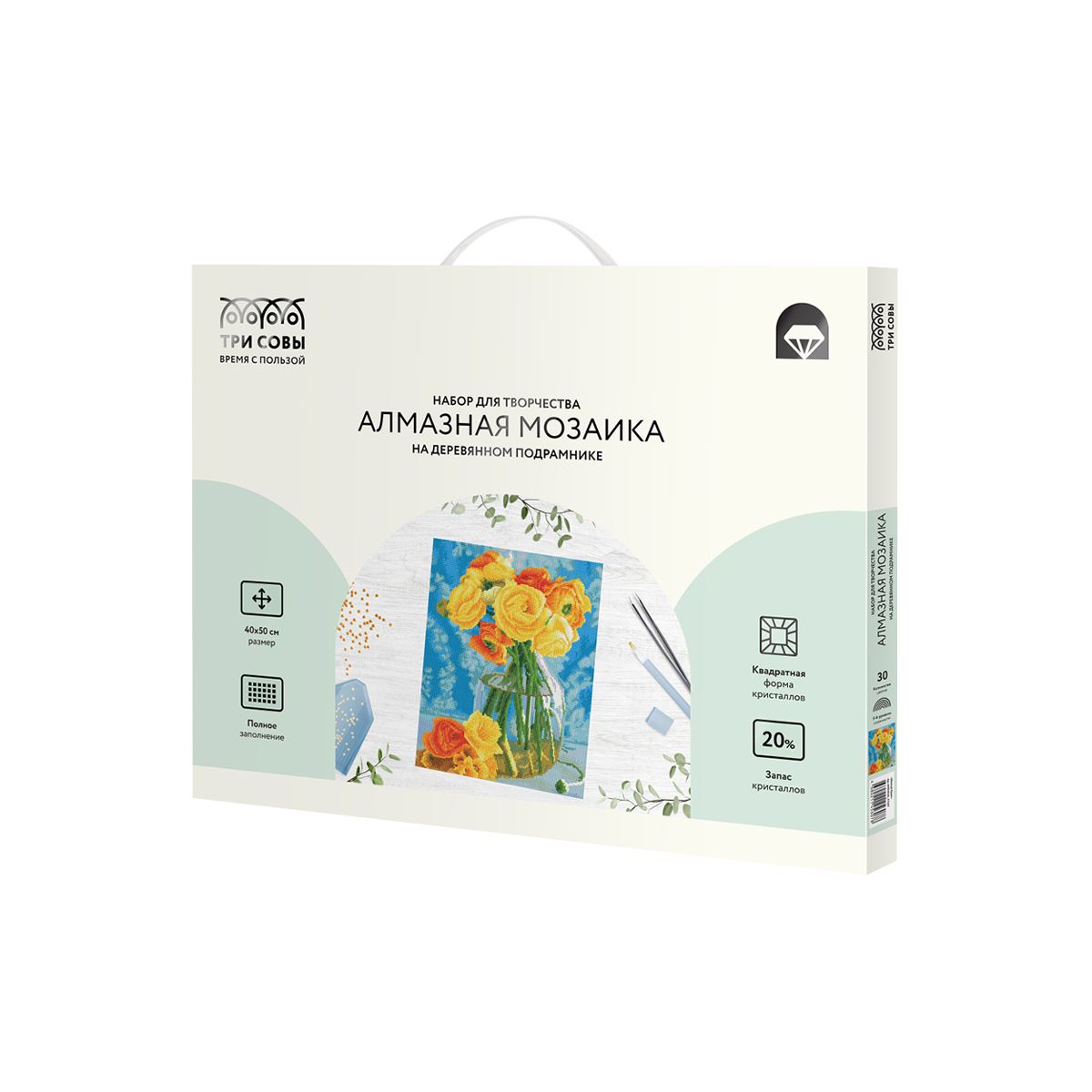 Алмазная мозаика ТРИ СОВЫ "Желтый букет", 40*50см, холст на деревянном подрамнике, картонная коробка с пластиковой ручкой