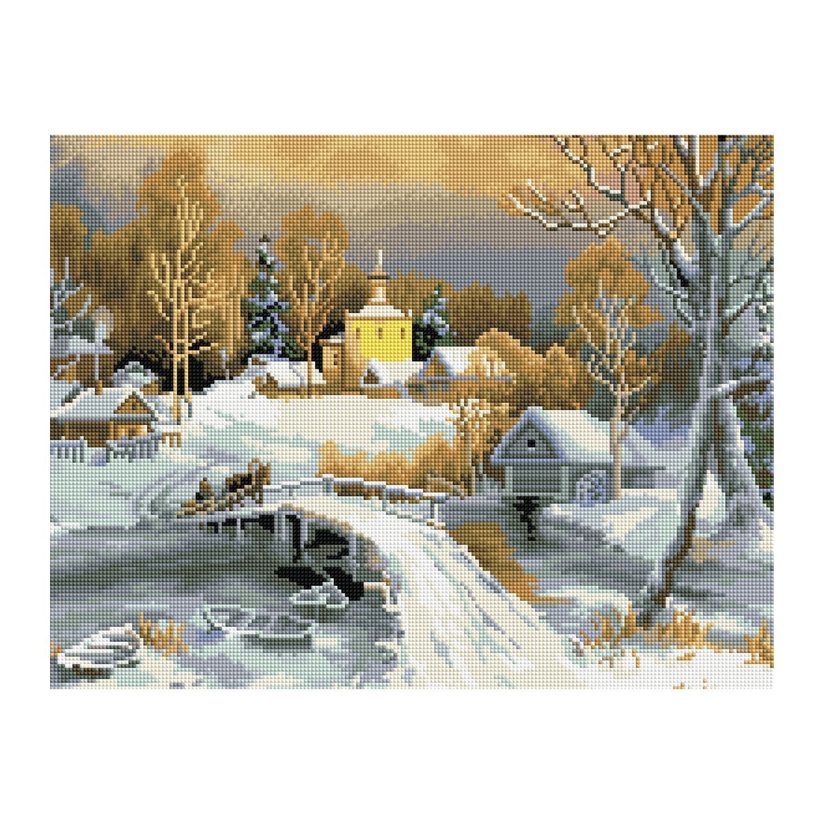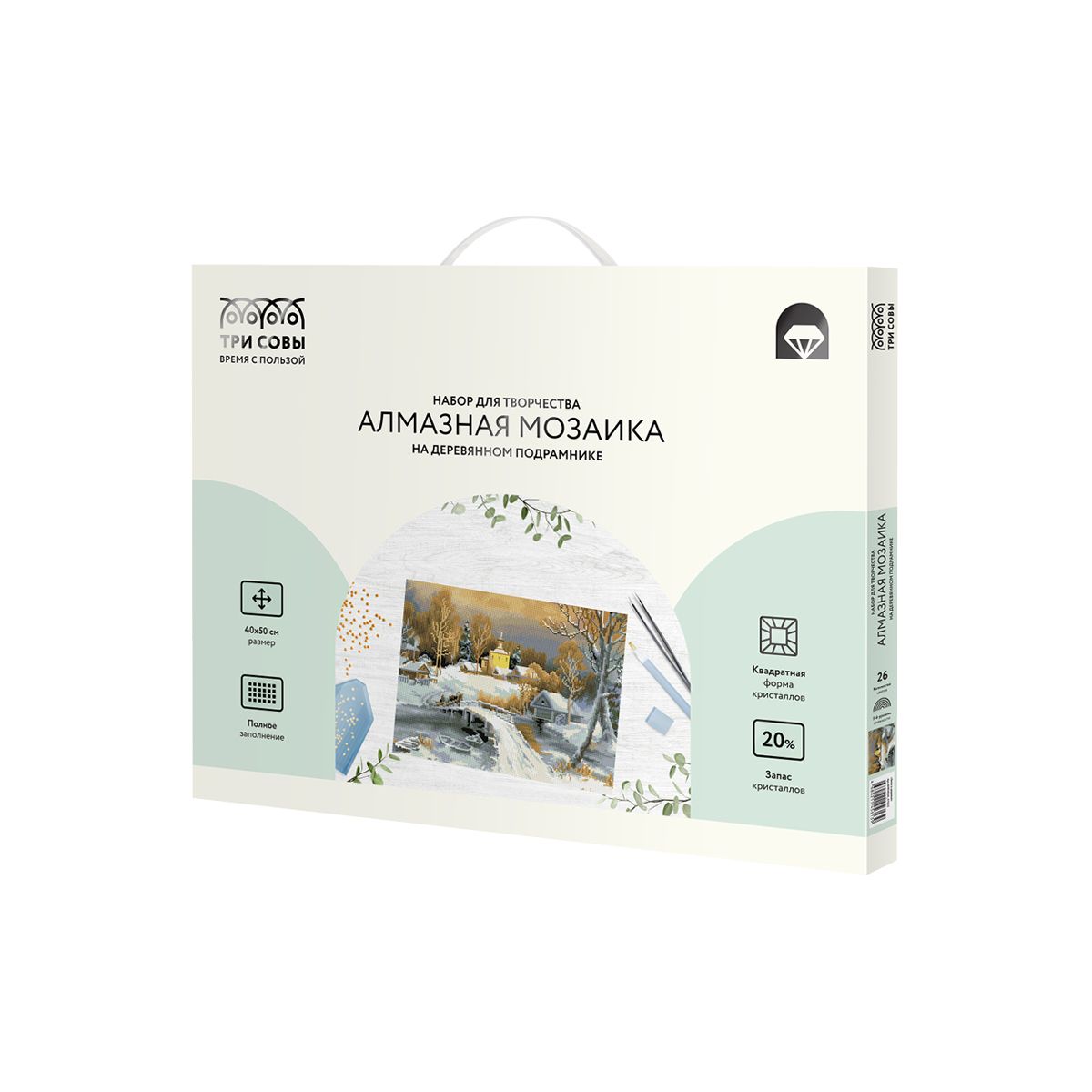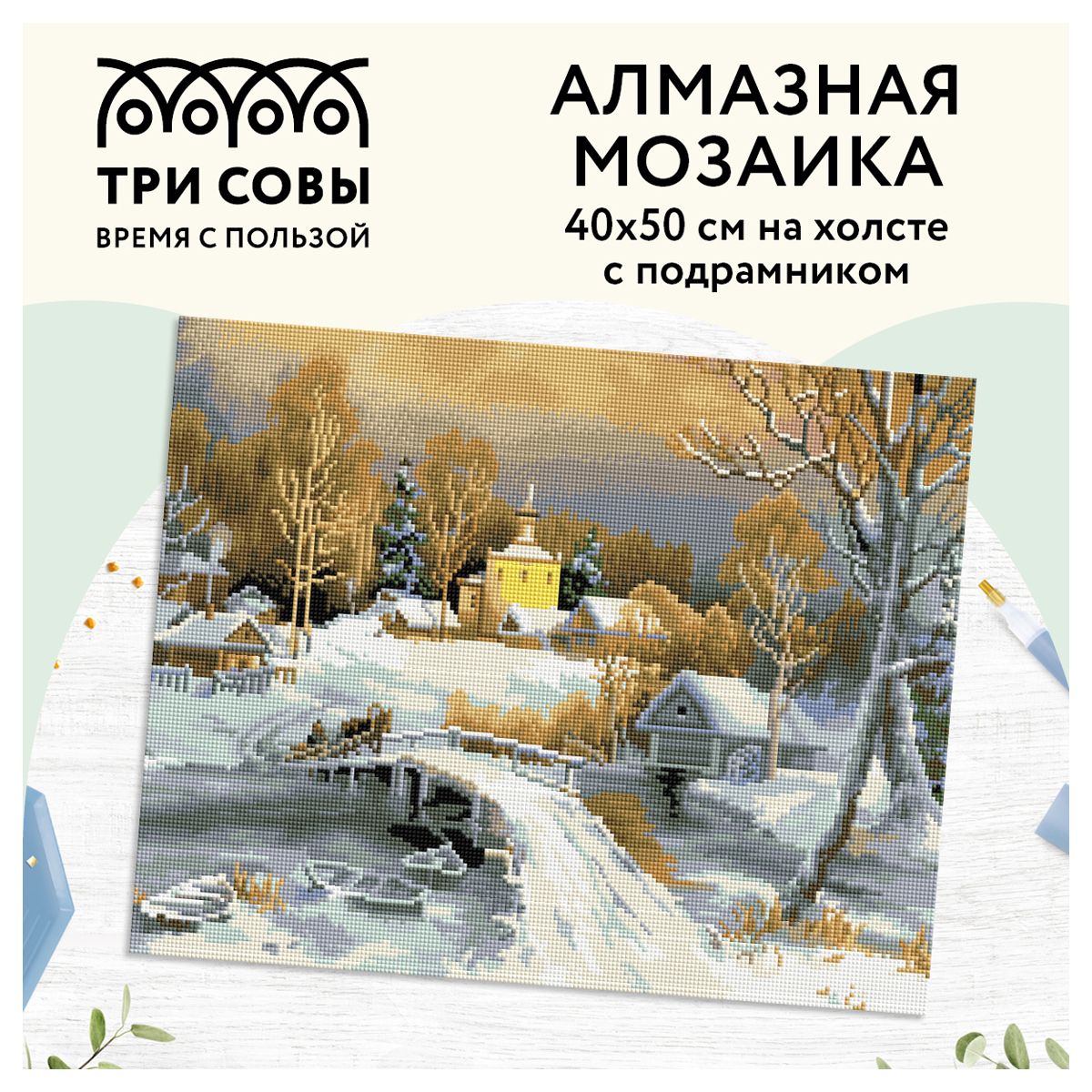 Алмазная мозаика ТРИ СОВЫ "Зима в деревне", 40*50см, холст на деревянном подрамнике, картонная коробка с пластиковой ручкой