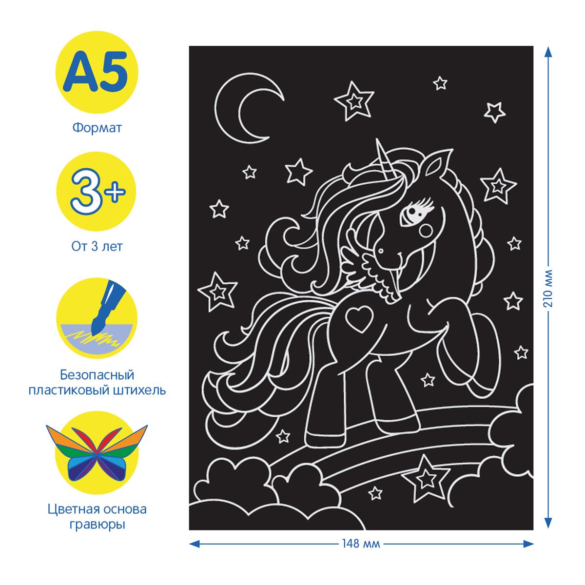 Гравюра Мульти-Пульти "Единороги", А5, разноцветная основа, пакет с европодвесом