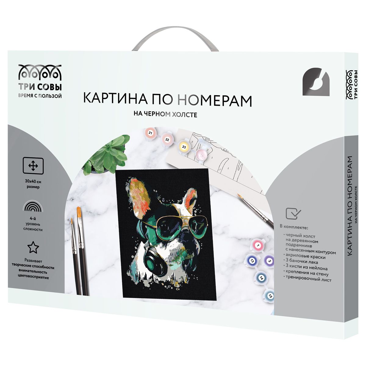 Картина по номерам на черном холсте ТРИ СОВЫ "Меломан", 30*40, c акриловыми красками и кистями