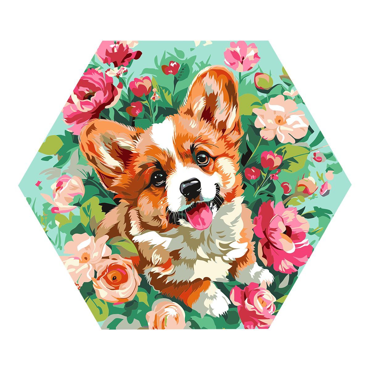 Картина по номерам на фигурном холсте ТРИ СОВЫ "Корги в цветах", форма многоугольник, с акриловыми красками и кистями