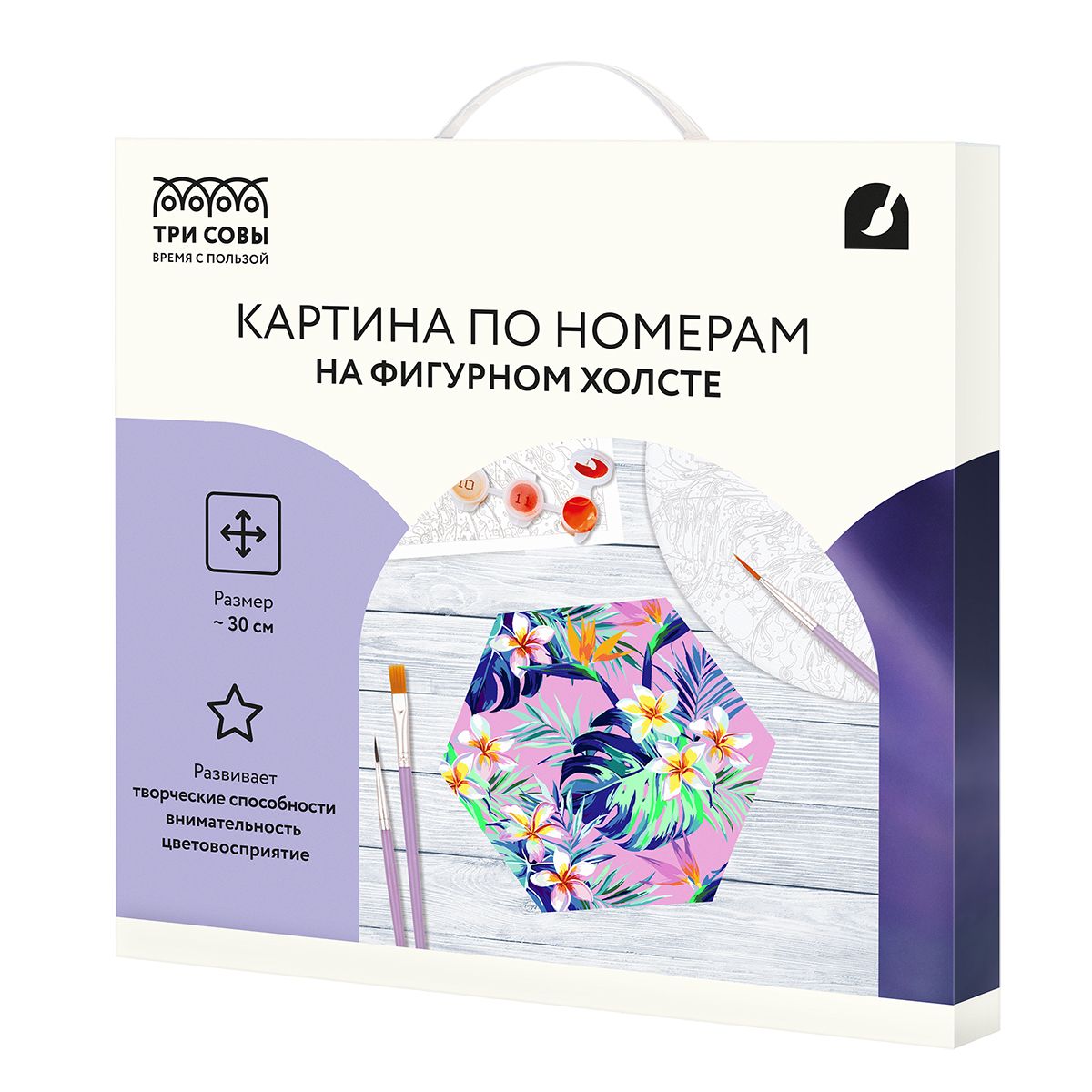 ∙ холст на деревянном подрамнике в форме многоугольника диаметром 30 см с нанесенным контуром, пронумерованный в соответствии с номерами красок. Контур под раскрашивание нанесен и на торцы подрамника, что позволяет разместить готовую работу на стене, не обрамляя в багет или раму. Технология точной разбивки сюжета картины на разные цветовые оттенки гарантируют правильность исполнения полотна;