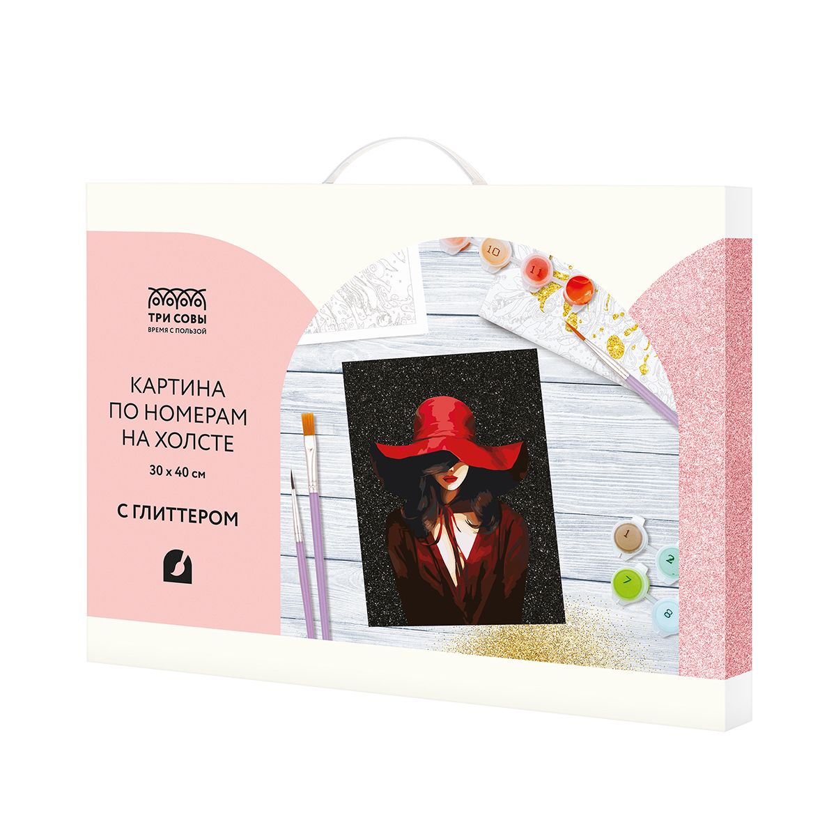 Картина по номерам на холсте с глиттером ТРИ СОВЫ "Девушка в красном", 30*40, с акриловыми красками и кистями