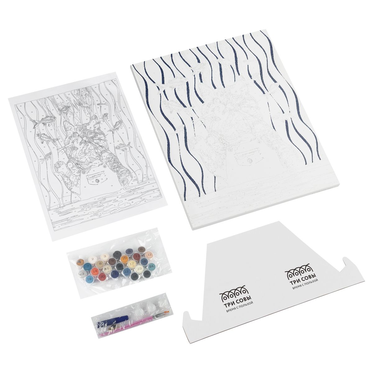 ∙ 24 акриловые краски с высокой укрывистостью на водной основе в пронумерованных баночках;