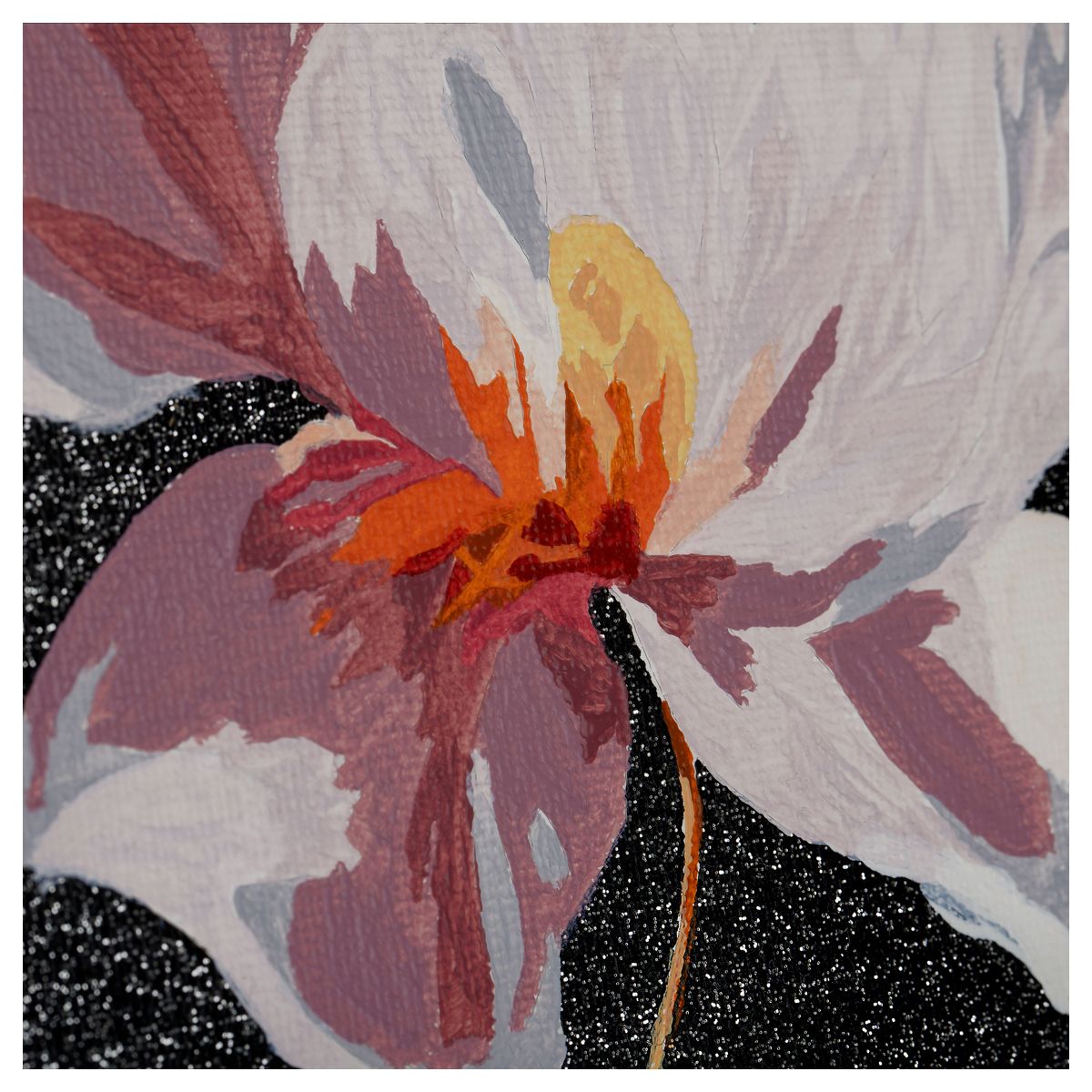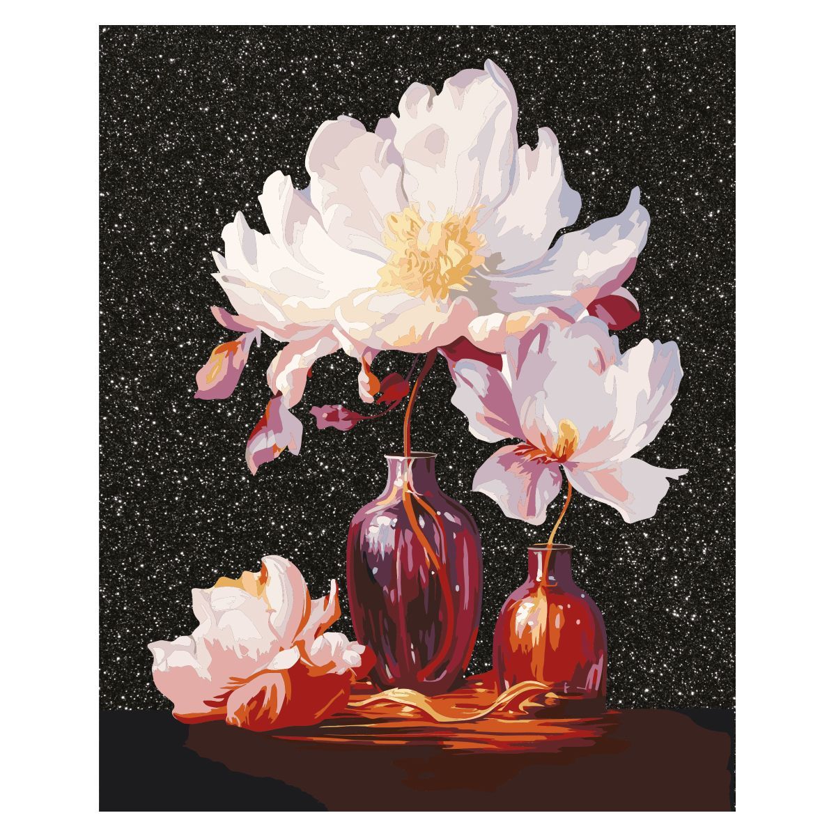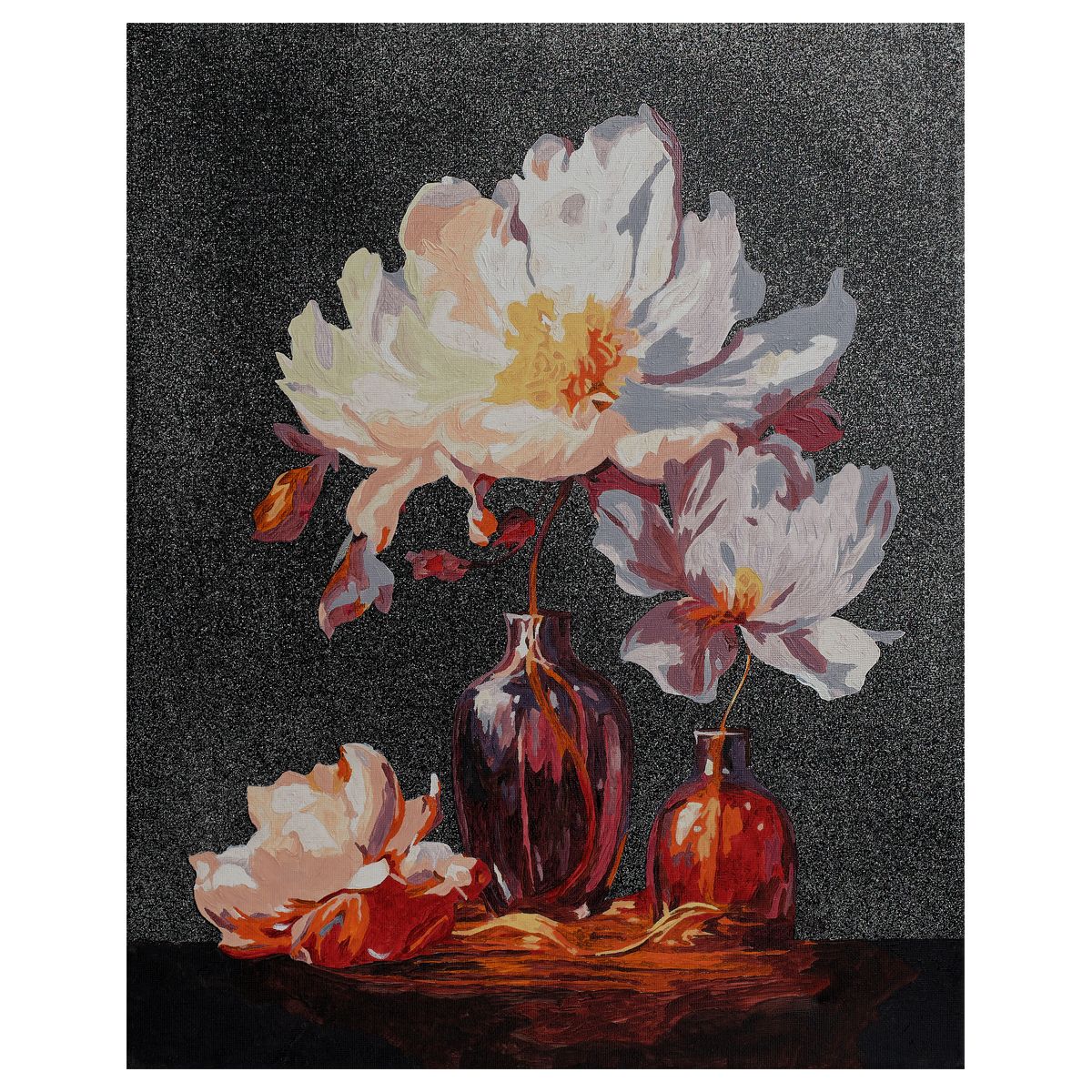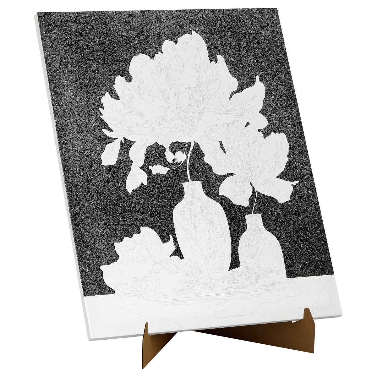 ∙ холст с глиттером на деревянном подрамнике размером 40*50 см с нанесенным контуром, пронумерованный в соответствии с номерами красок. Технология точной разбивки сюжета картины на разные цветовые оттенки гарантируют правильность исполнения полотна;