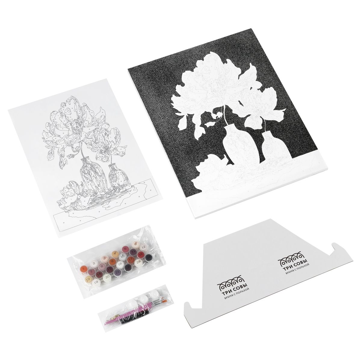 ∙ 24 акриловые краски с высокой укрывистостью на водной основе в пронумерованных баночках;