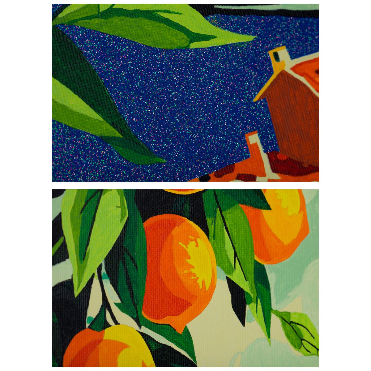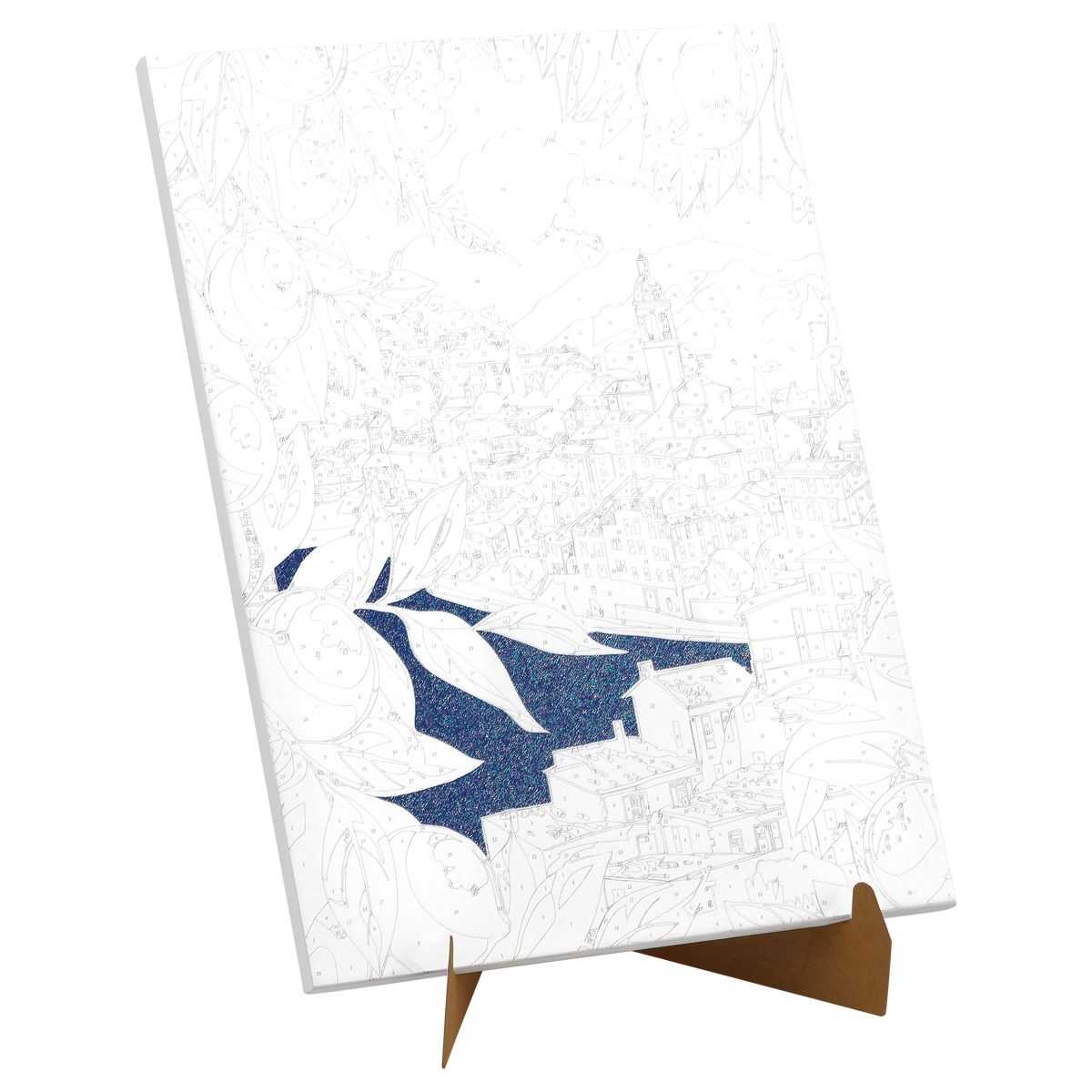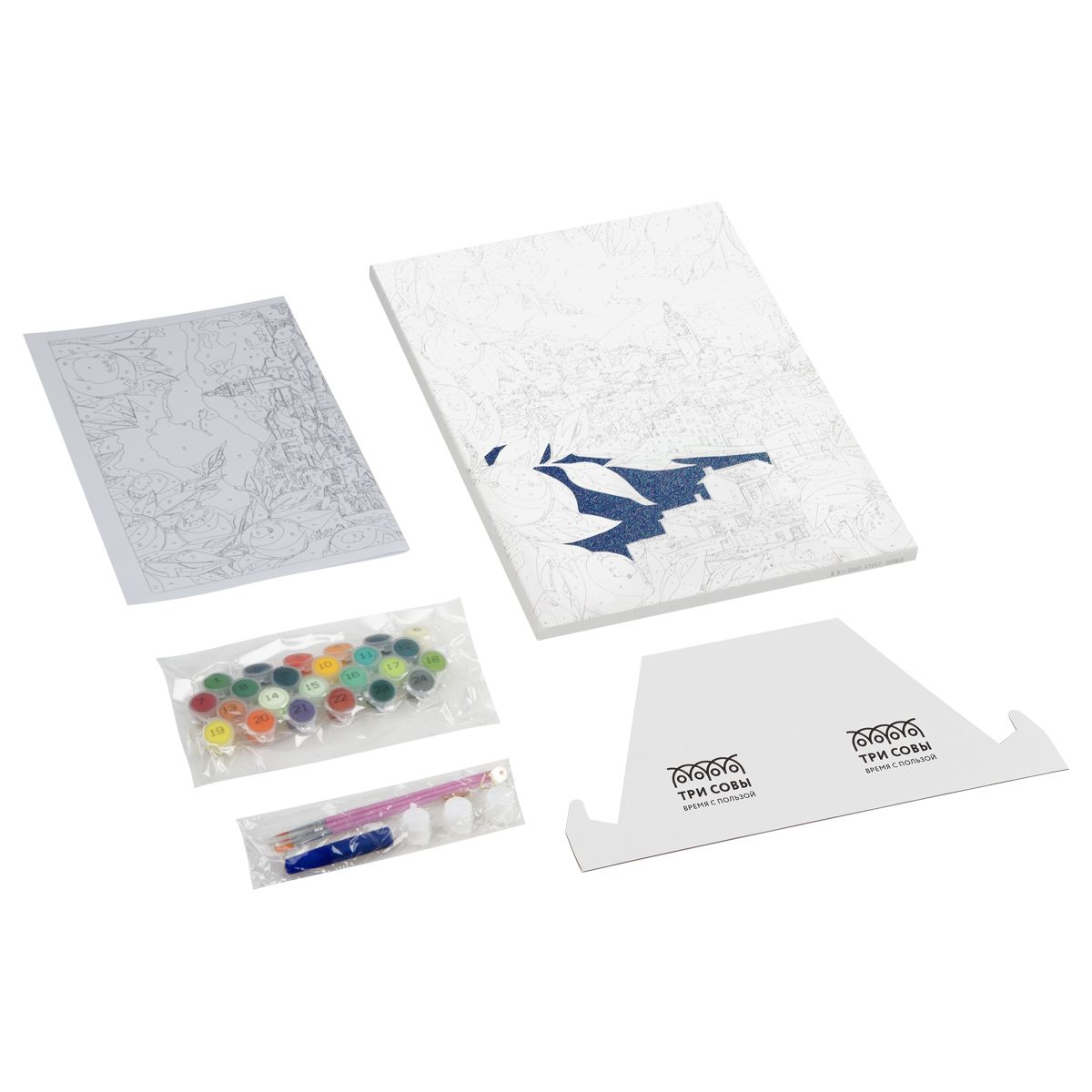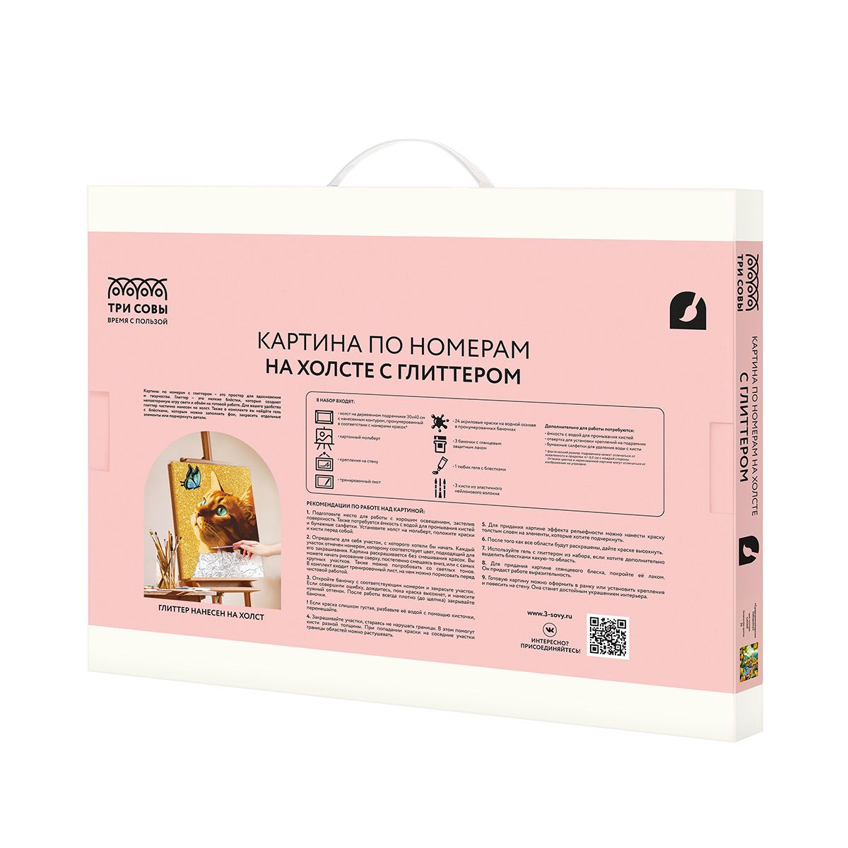 ∙ холст с глиттером на деревянном подрамнике размером 30*40 см с нанесенным контуром, пронумерованный в соответствии с номерами красок. Технология точной разбивки сюжета картины на разные цветовые оттенки гарантируют правильность исполнения полотна;