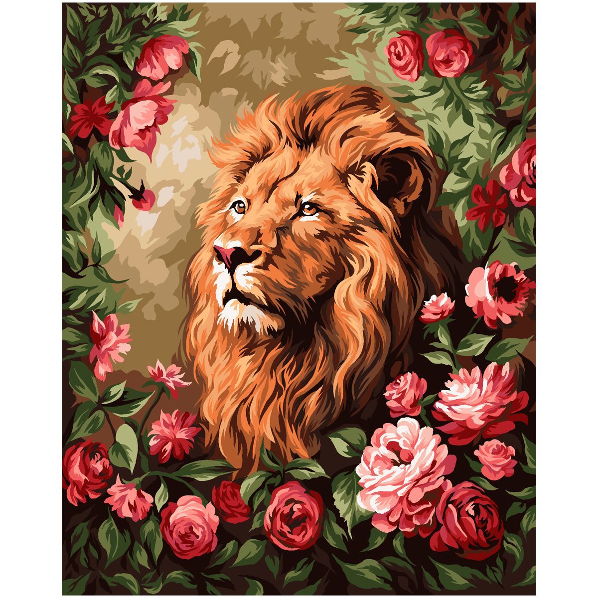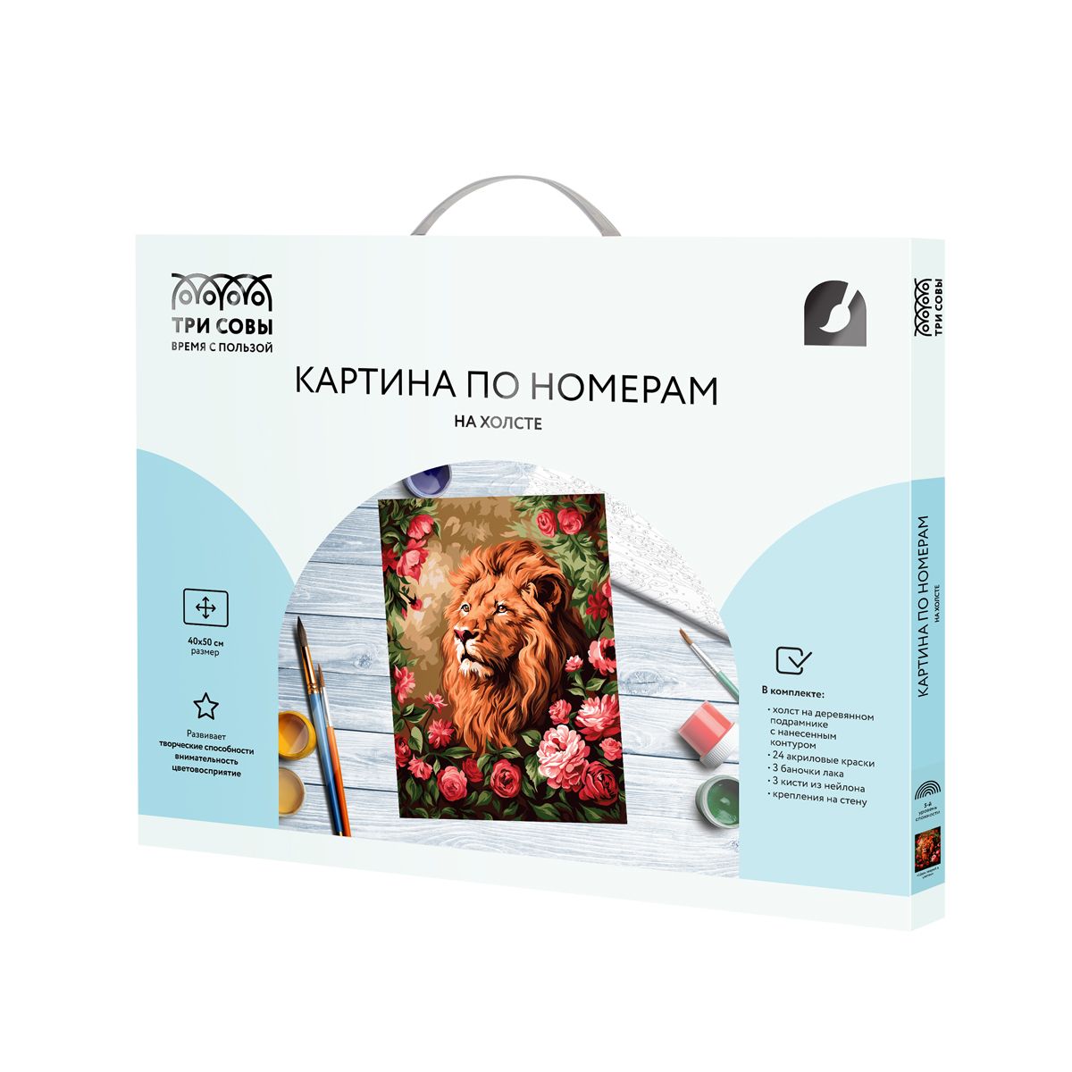 Картина по номерам на холсте ТРИ СОВЫ "Царь зверей в цветах", 40*50, с акриловыми красками и кистями
