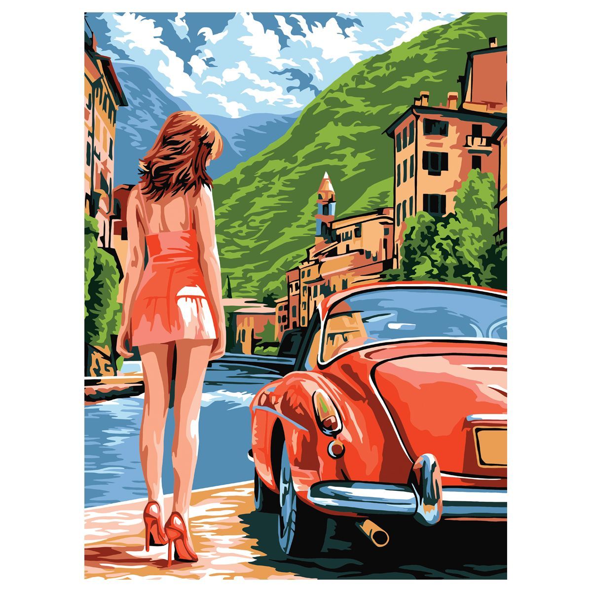 УЦЕНКА - Картина по номерам на картоне ТРИ СОВЫ "Девушка и ретро автомобиль", 30*40, с акриловыми красками и кистями