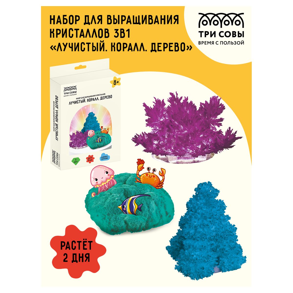Набор для выращивания кристаллов 3в1 ТРИ СОВЫ "Лучистый. Коралл. Дерево", фиолетовый, изумрудный, голубой