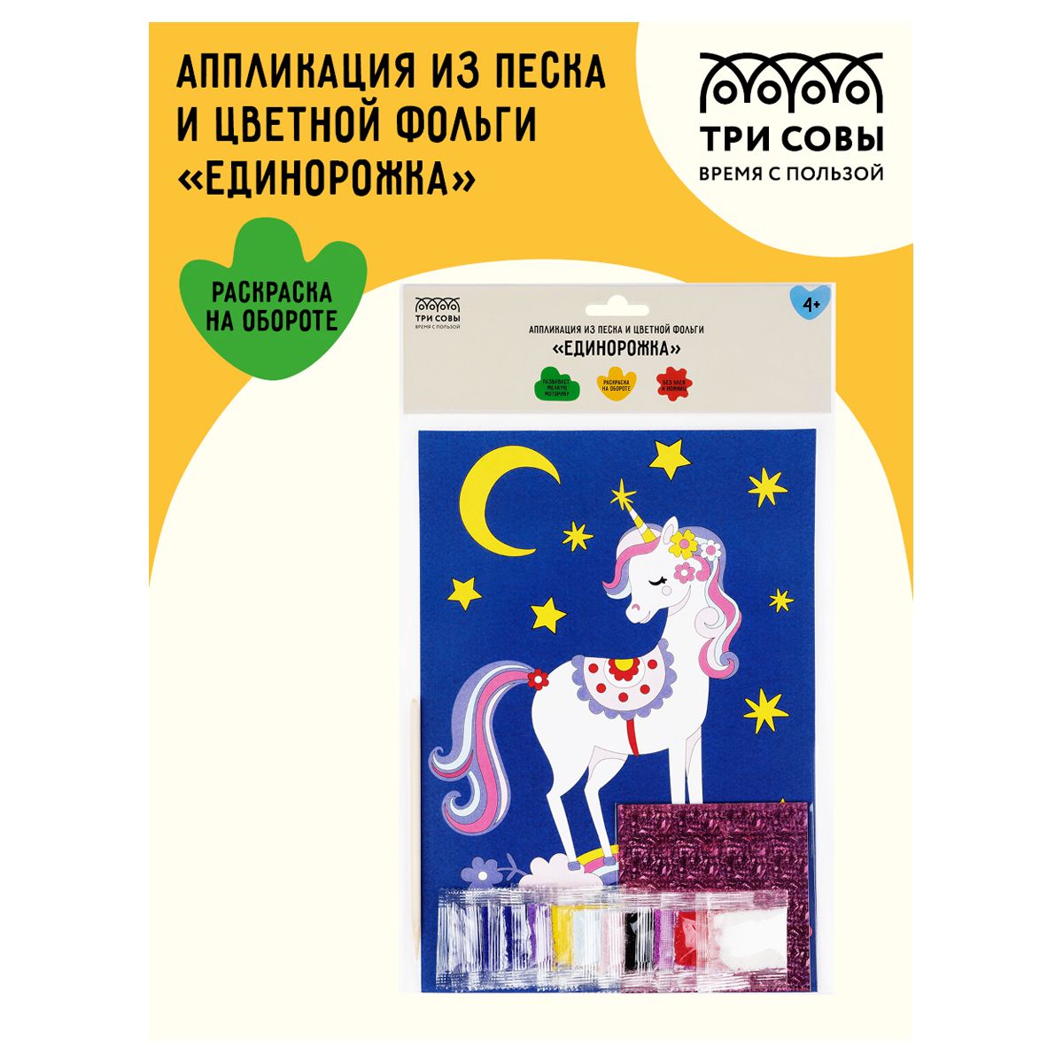 Аппликация из песка и цветной фольги ТРИ СОВЫ "Единорожка", с раскраской, пакет с европодвесом