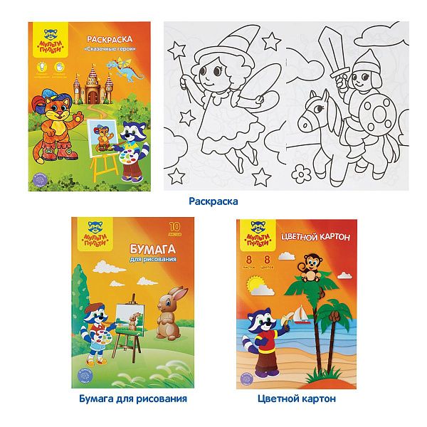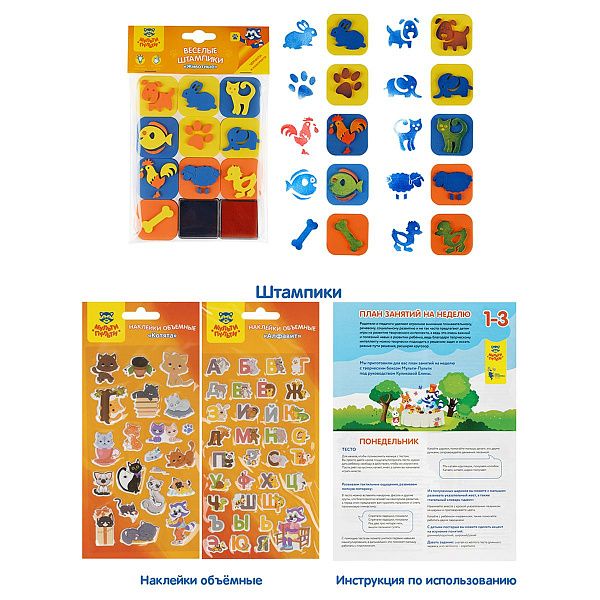 • Наборы с тематическими раскрасками, трафаретами и обучающими карточками.