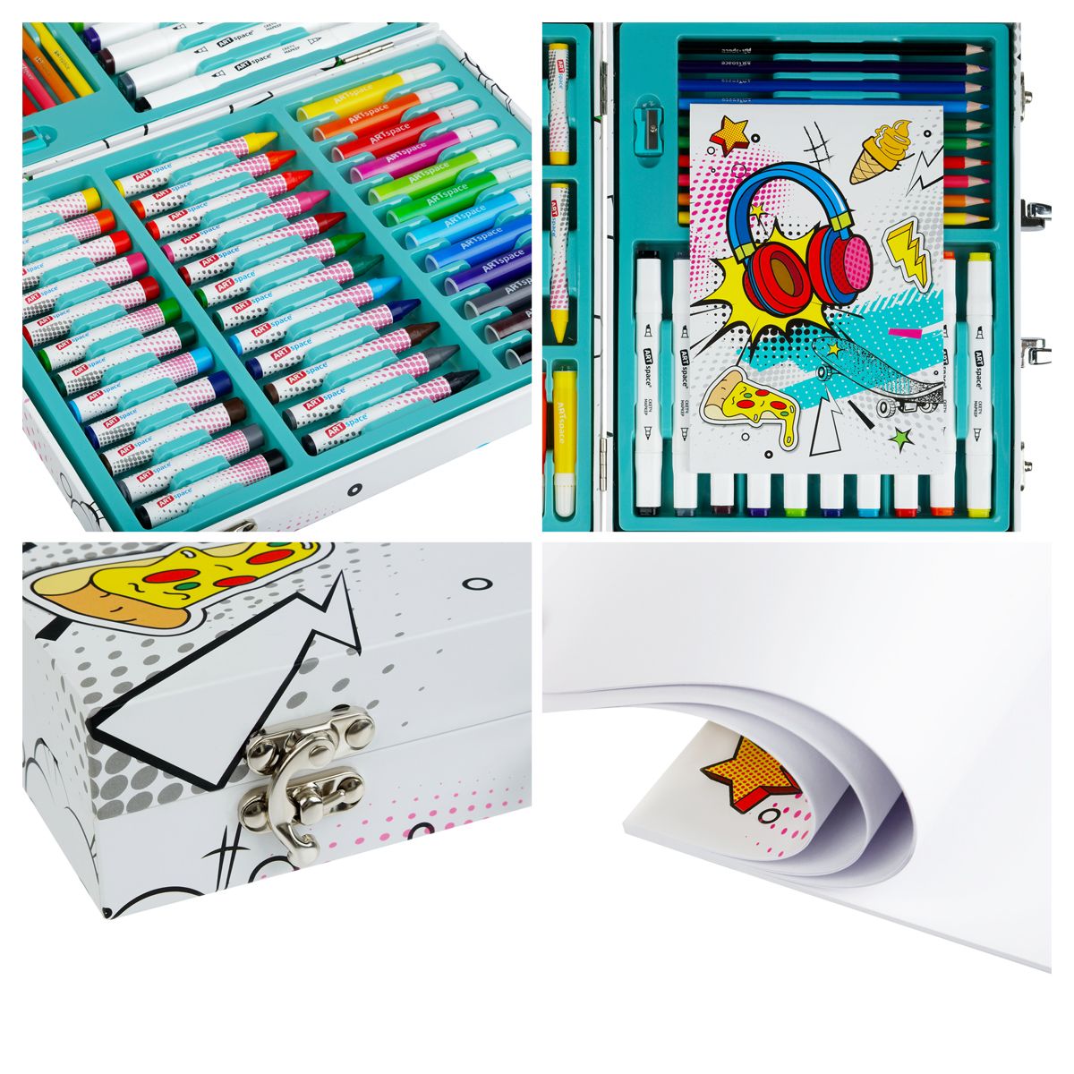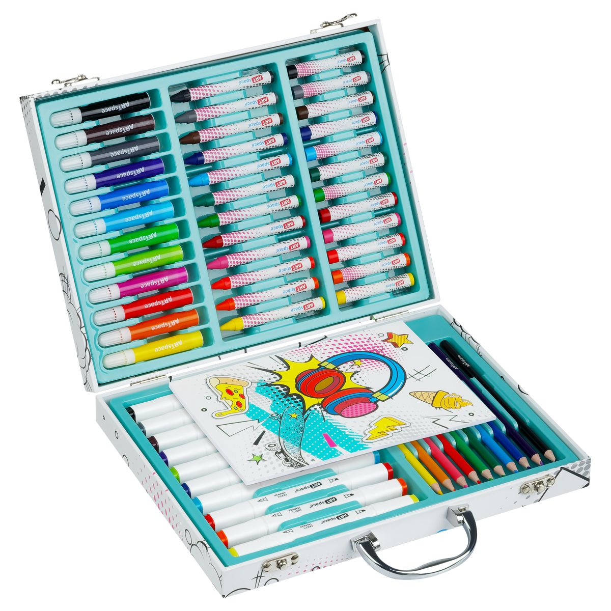 В наборе яркие цвета и разнообразные оттенки для создания лучших шедевров: 10 цветов маркеров для скетчинга, 12 цветов фломастеров с чернилами на водной основе, 10 цветов карандашей с мягким грифелем, 12 цветов пастелей и 12 цветов восковых мелков. В комплекте есть точилка, что позволит не прерывать увлекательный процесс рисования.