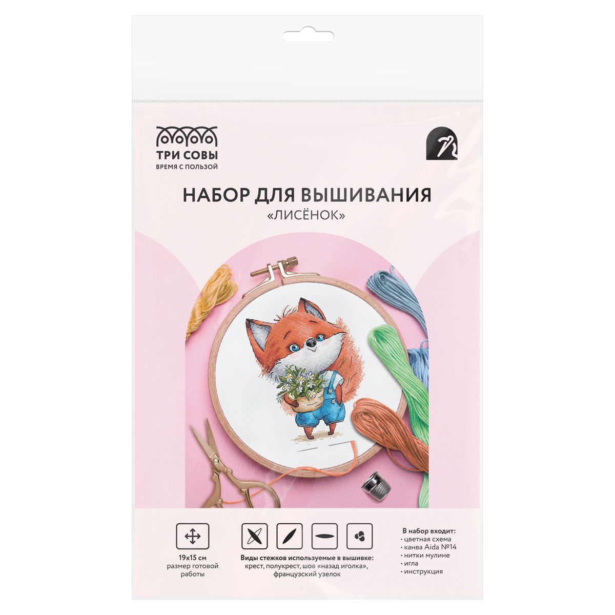 Набор для вышивания крестиком ТРИ СОВЫ "Лисенок", 19*15см, пакет с европодвесом