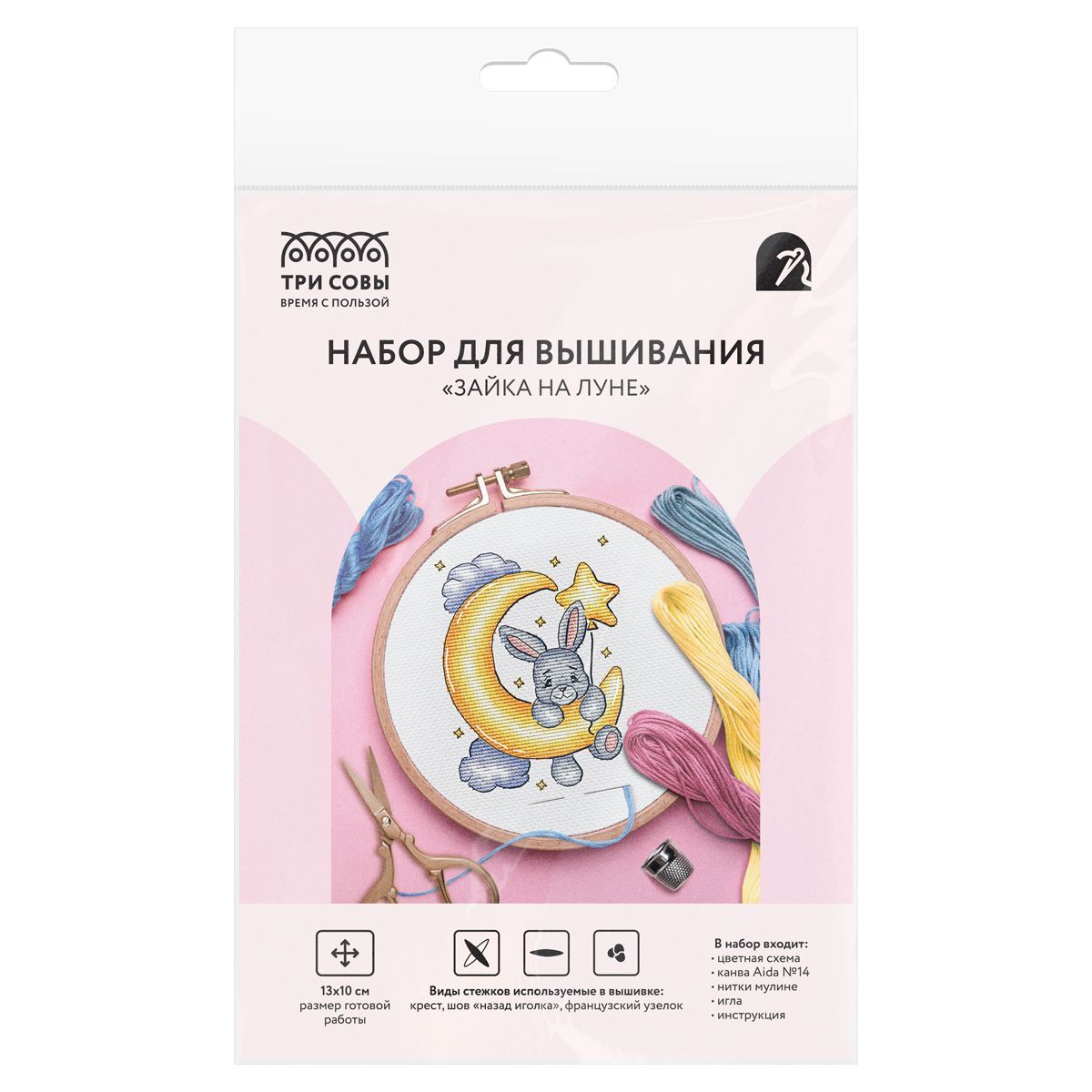 Набор для вышивания крестиком ТРИ СОВЫ "Зайка на луне", 10*13см, пакет с европодвесом