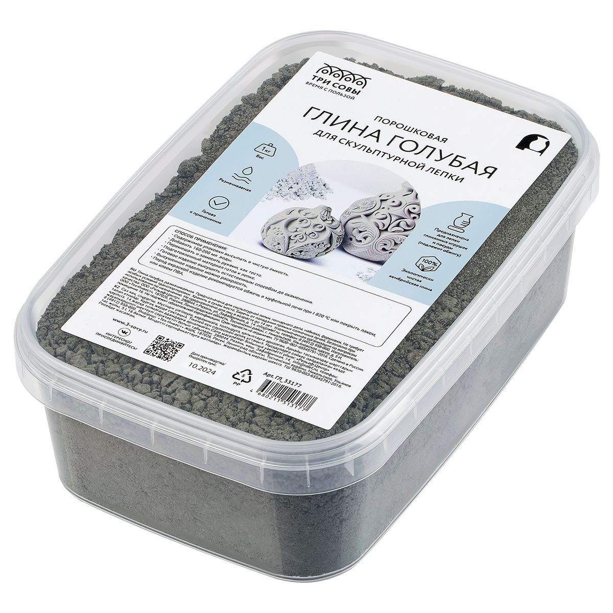 Глина для скульптурной и художественной лепки ТРИ СОВЫ, голубая, запекаемая, 1кг, порошковая, пластиковый контейнер