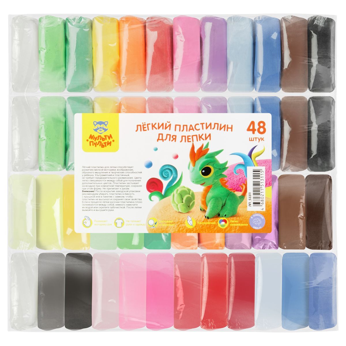 Легкий пластилин для лепки Мульти-Пульти, 48шт., 480г, прозрачный пакет