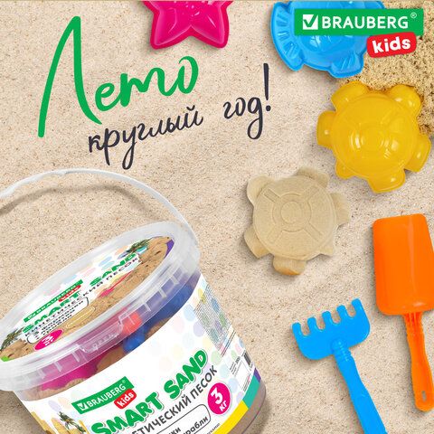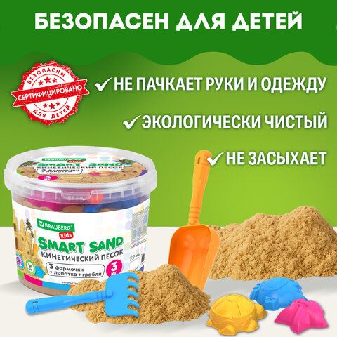 Песок для лепки кинетический песочный 3000 г, 3 формочки, лопатка, грабли, ведро, BRAUBERG KIDS, 665480