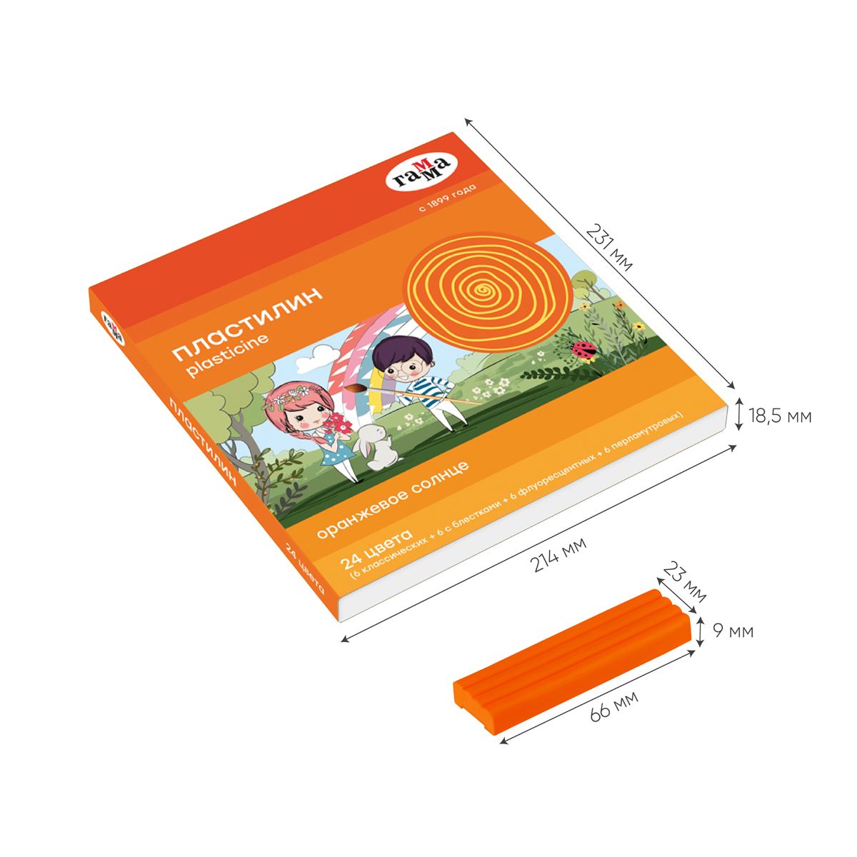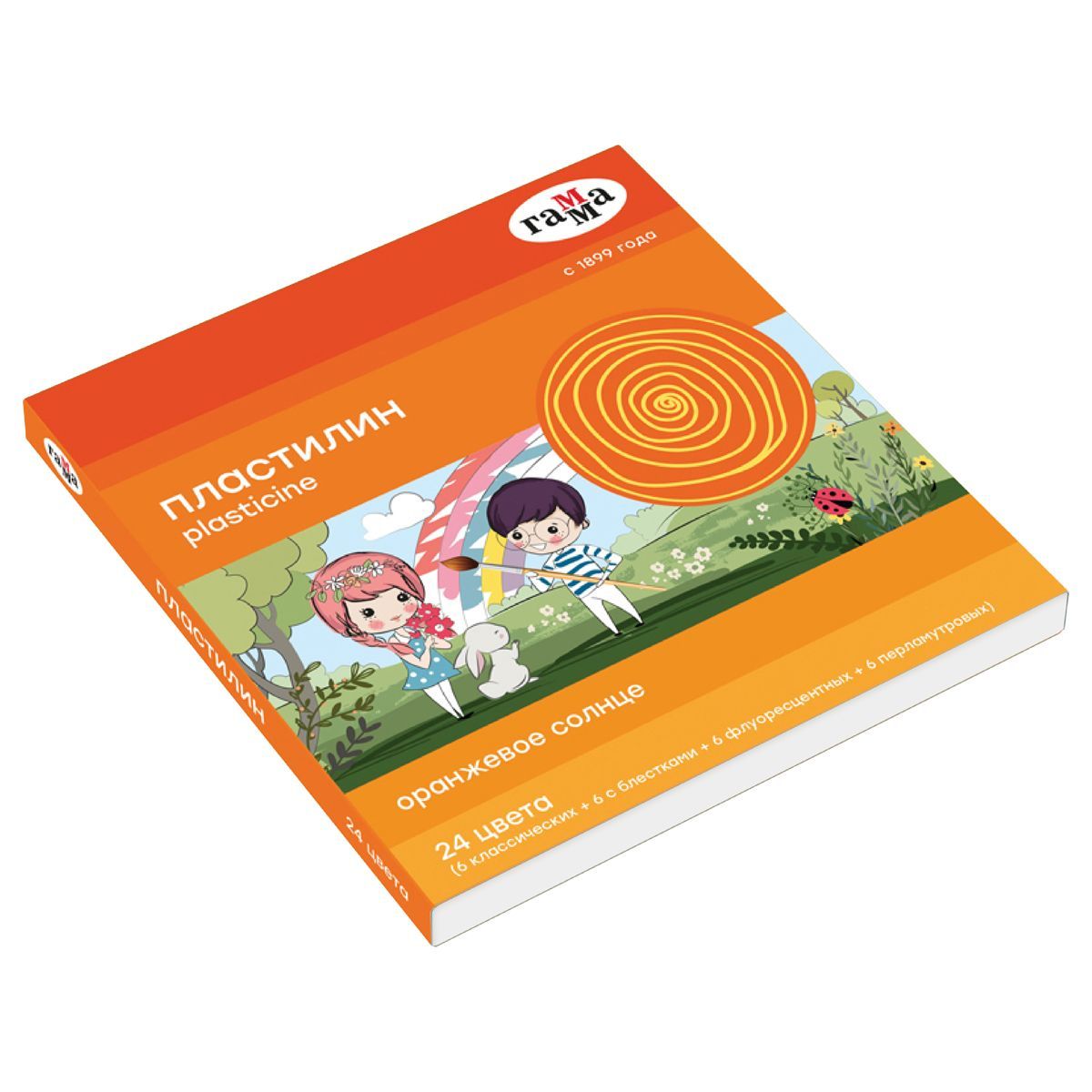 Пластилин Гамма "Оранжевое солнце", 24 цвета (6 классич., 6 с блестк., 6 перл., 6 флуор.), 312г, со стеком, картон. упаковка