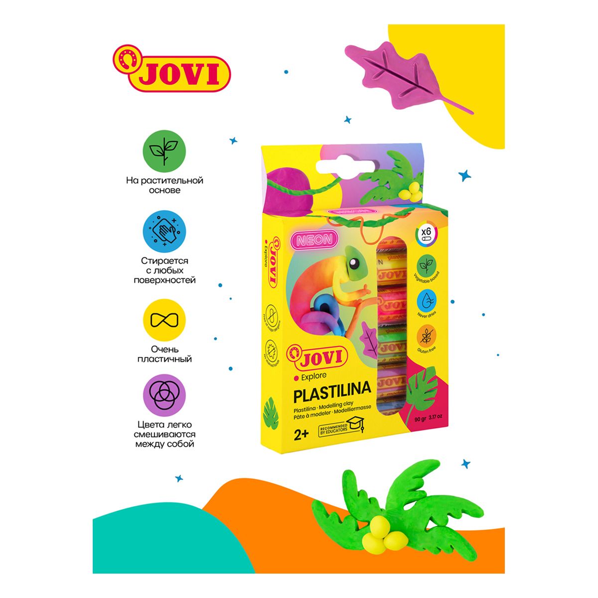 Пластилин JOVI, 06 цветов, 90г, растительный, флуоресцентный, картон, европодвес
