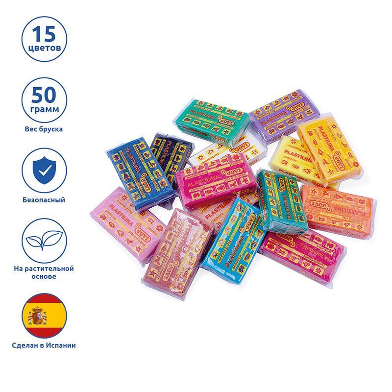 Набор пластилина из пятнадцати цветов (белый, желтый, оранжевый, розовый, красный, малиновый, голубой, синий, зеленый, темно-зеленый, фиолетовый, телесный, черный, темно-синий, кирпичный) 30 брусков по 50 грамм в картонной коробке. Страна производства Испания. Цена указана за брусок.