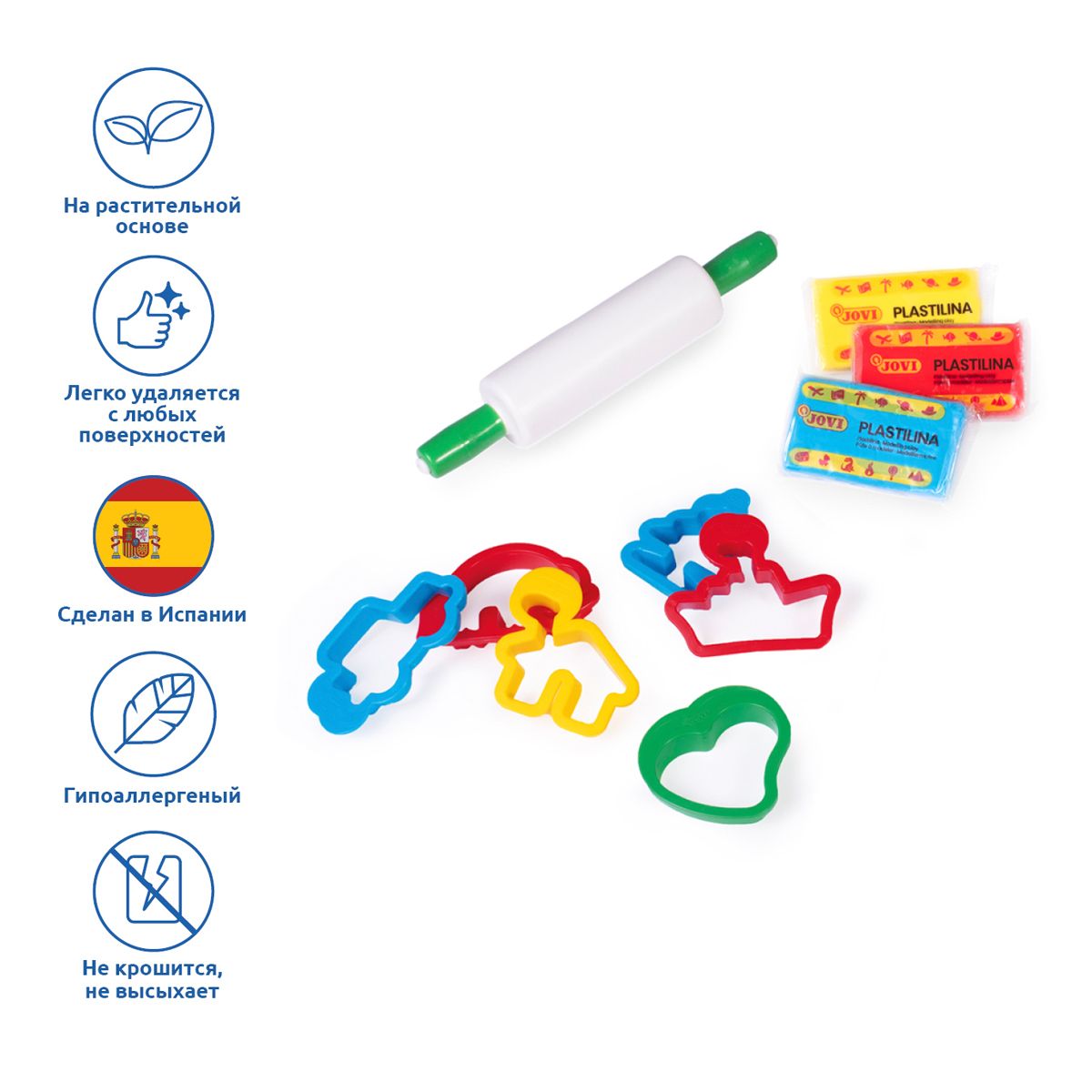 Пластилин JOVI "Super Kit", 03 цвета, 150г, растительный, 6 формочек, 1 скалка, картонная упаковка