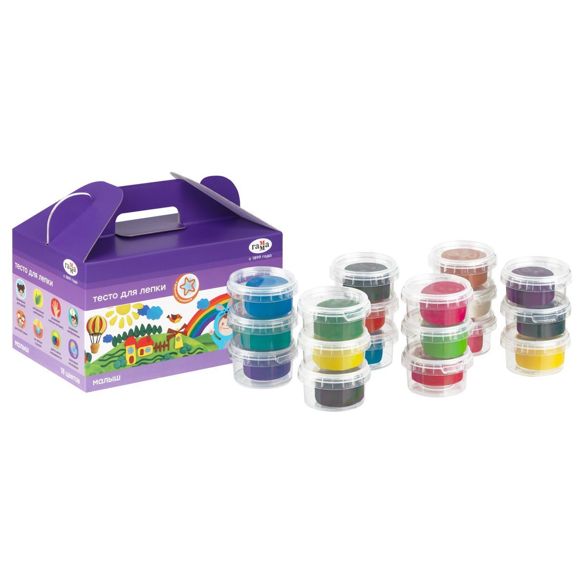 Тесто для лепки Гамма "Малыш", 18 цветов, 1080г, формочки, картонная коробка new