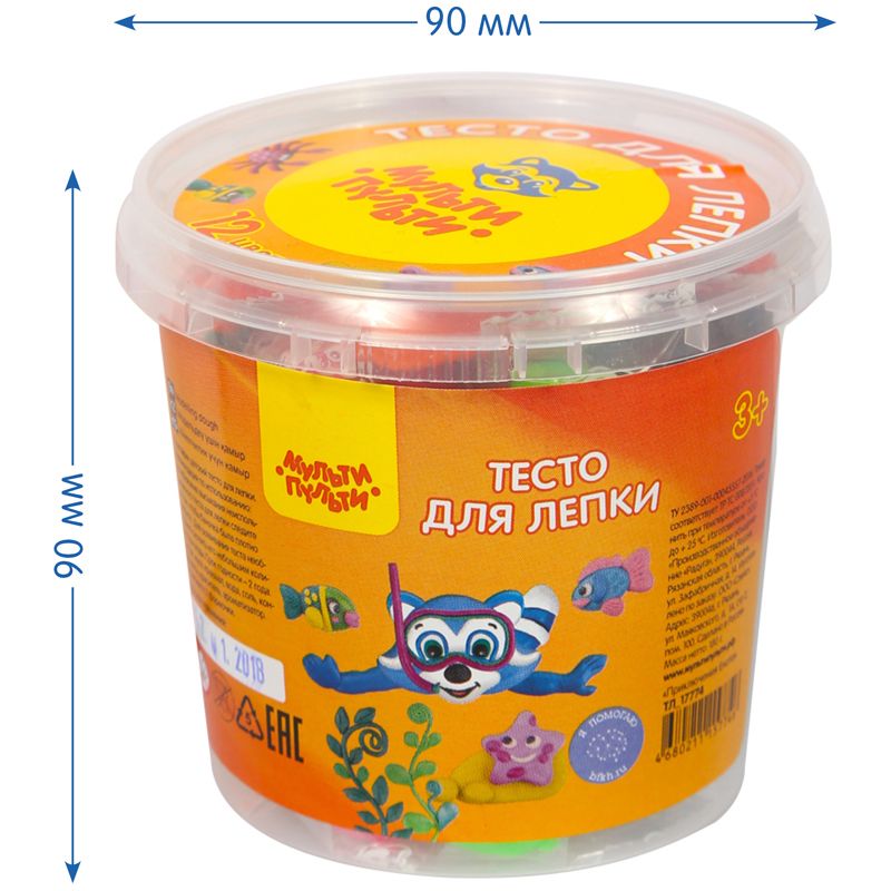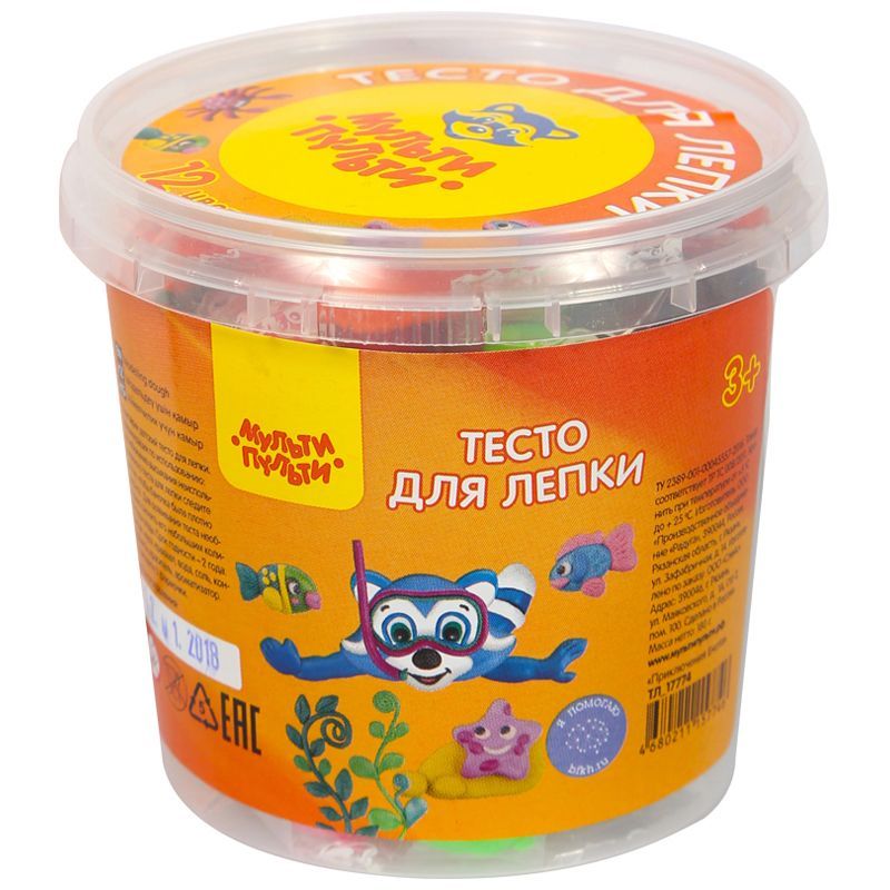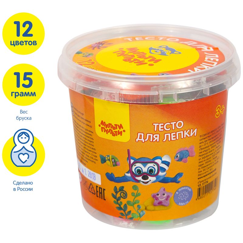 Тесто для лепки Мульти-Пульти "Приключения Енота", 12 цветов*15г, пластиковое ведро, 2 формочки